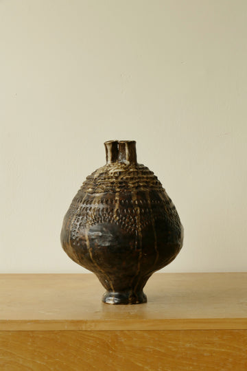 Fantastic triple spouted large ceramic vessel with all over texture. Dark brown with a drippy beige glaze. One spout is broken as shown in images.