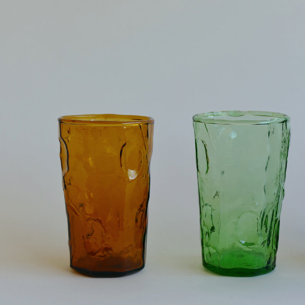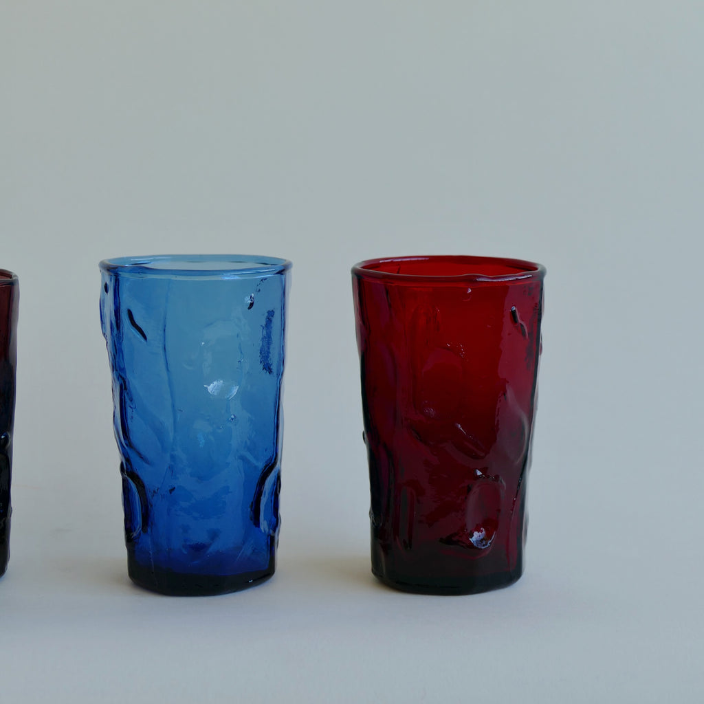 Set of five small Morgantown "Seneca" crinkle tumblers, in blue, green, red, ourple and orange. No chips or cracks. A delightful set to add to your bar, and perfect for extra guests or children.