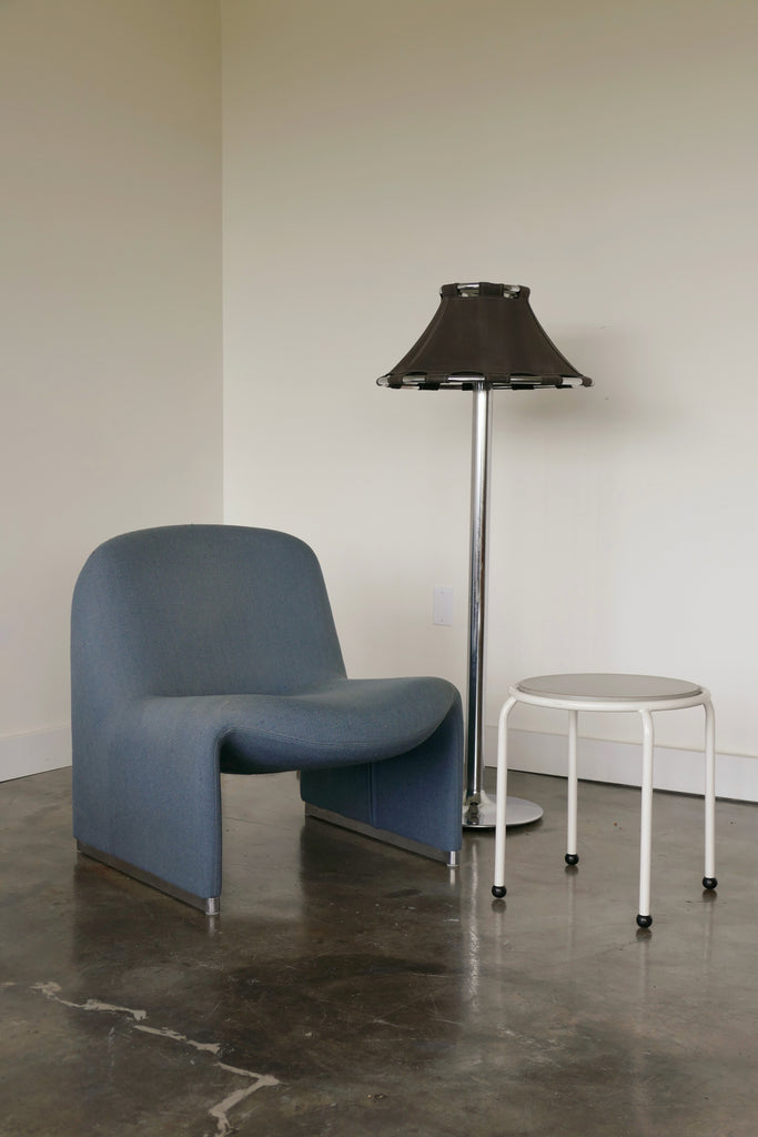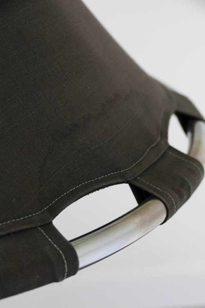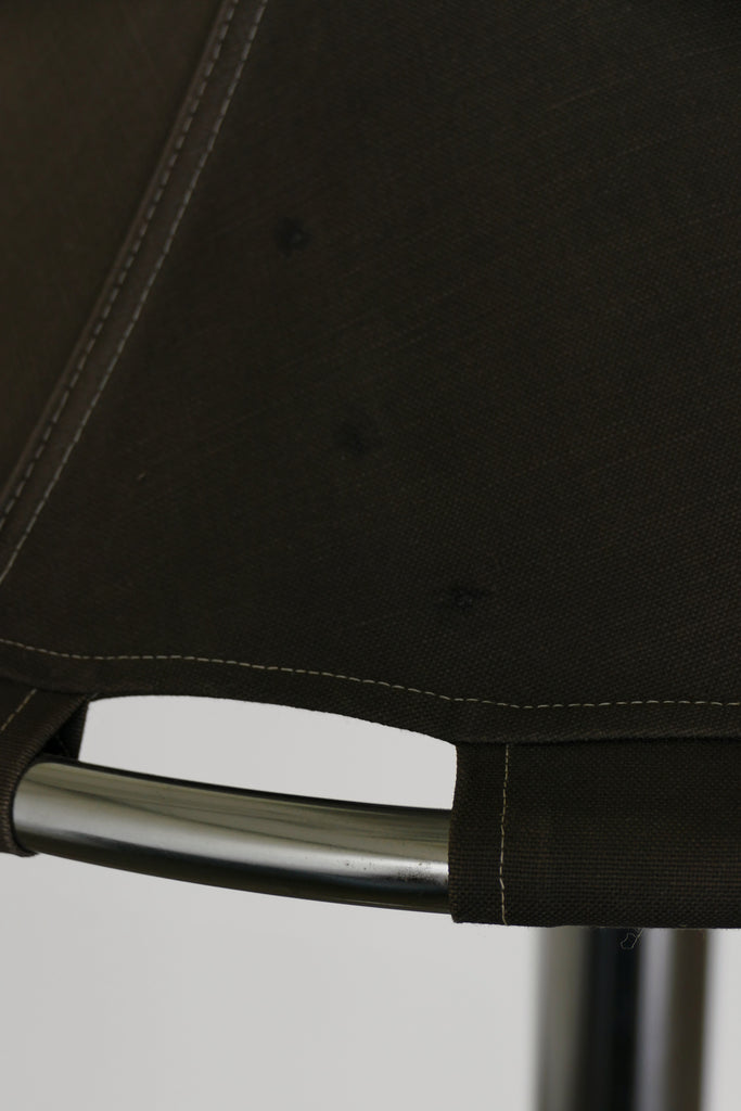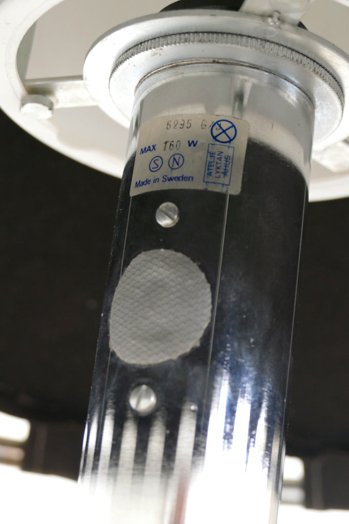 Phenomenal "Anna" floor lamp by Anna Ehrner for Ateljé Lyktan, Sweden, circa 1970s. Chrome body with a black cotton shade and visible topstitching. Small area of water damage and small area of spill marks, as shown. Overall good vintage condition. "Push" button on body has been removed. Interior plastic diffuser.