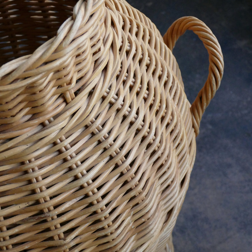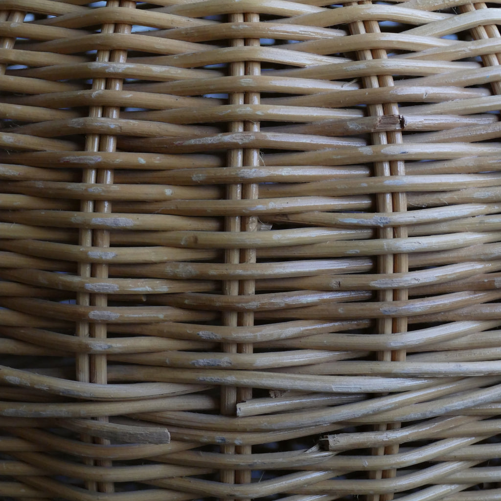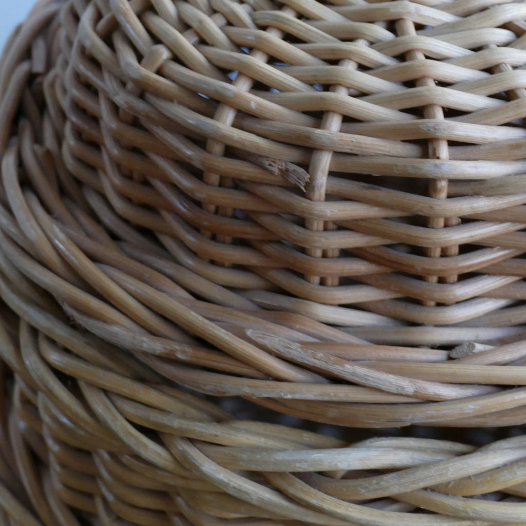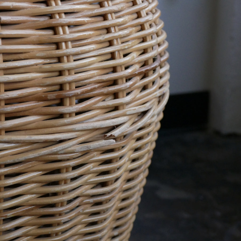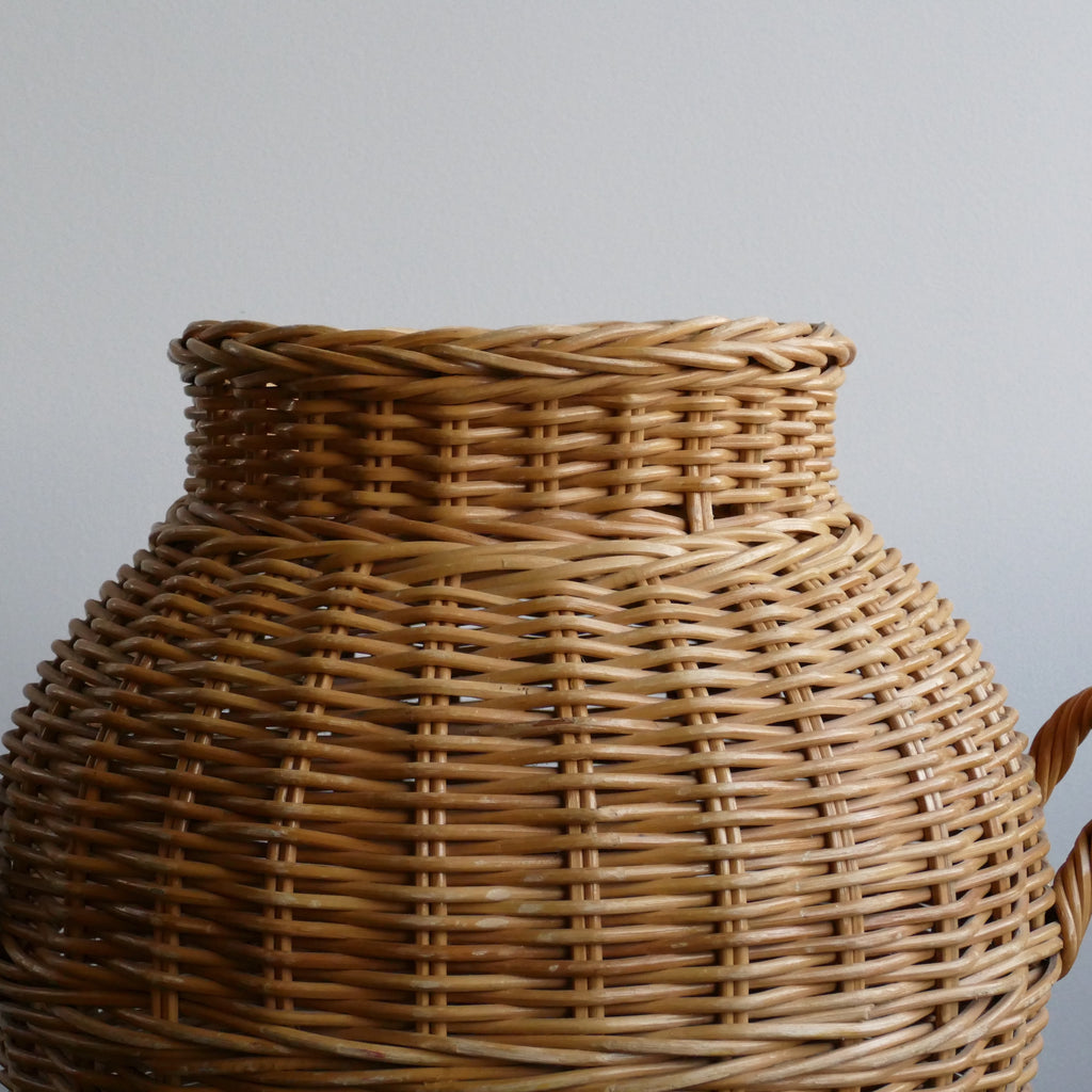 Large sculptural basket with lid nicely fills an empty corner or hallway. Minor breaks throughout as shown, overall very good condition.