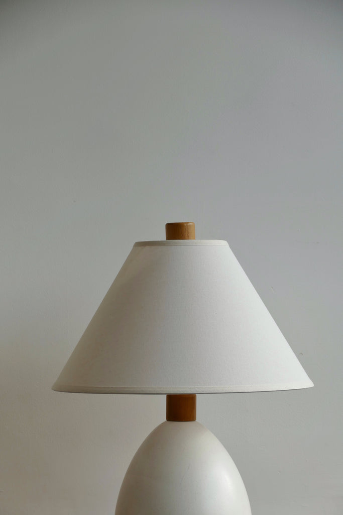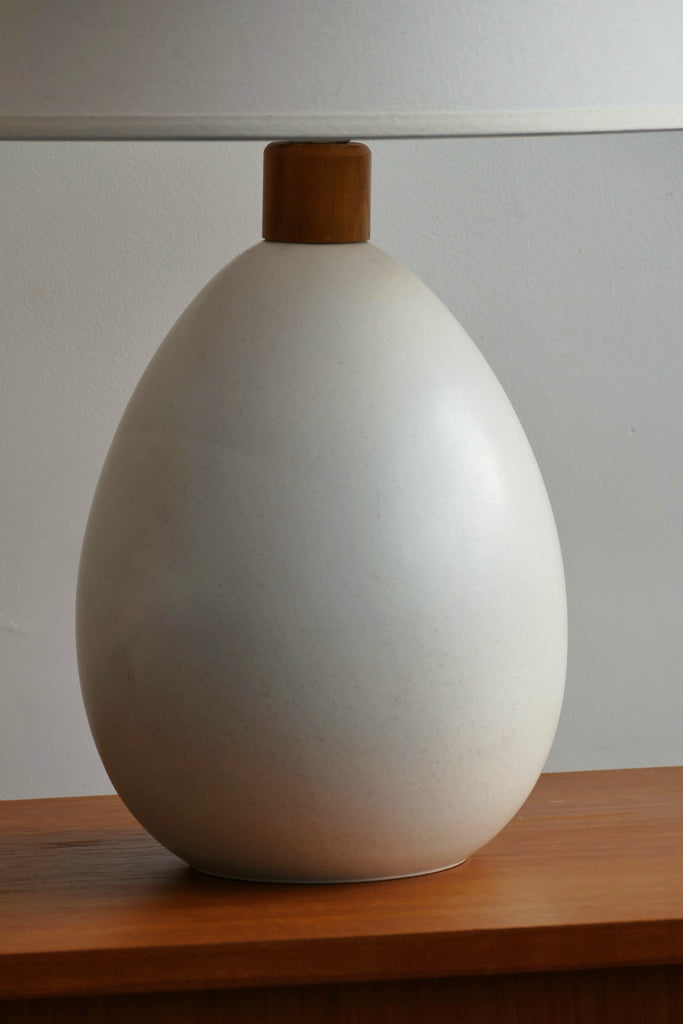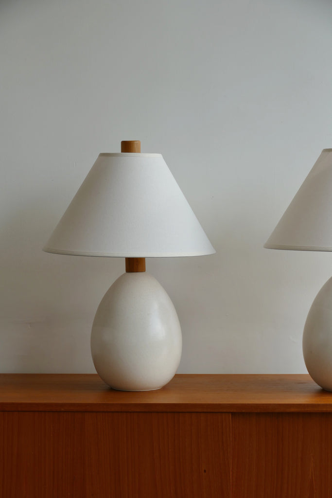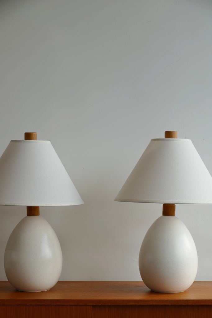 Pair of egg-shaped lightly speckled mid century modern ceramic table lamps. Lovely wood finials and detail at neck. Excellent condition. Sold as a pair.