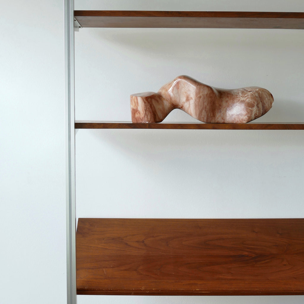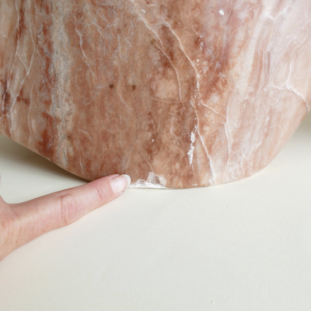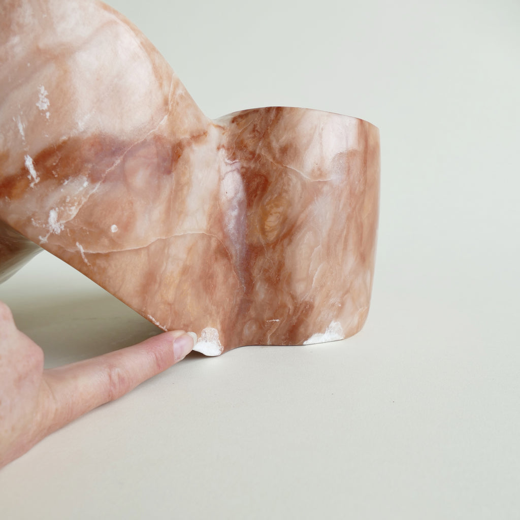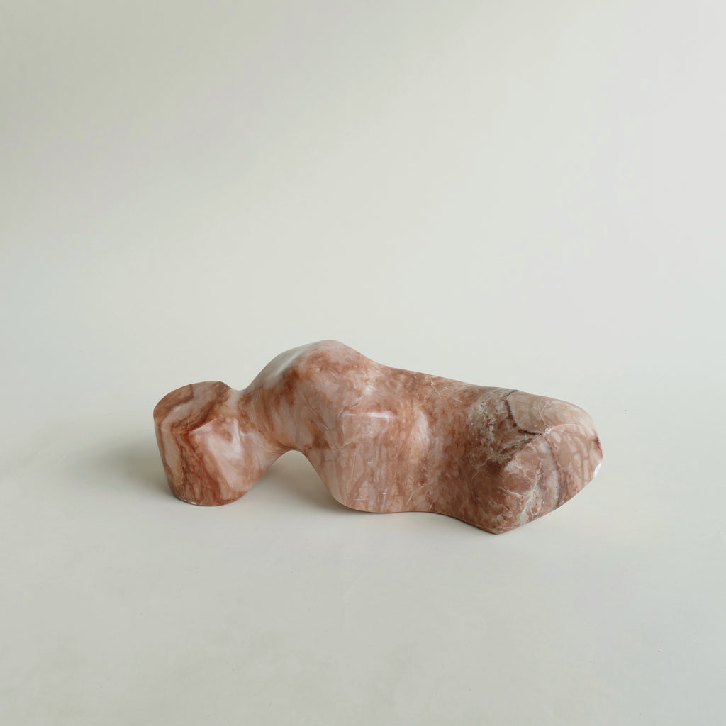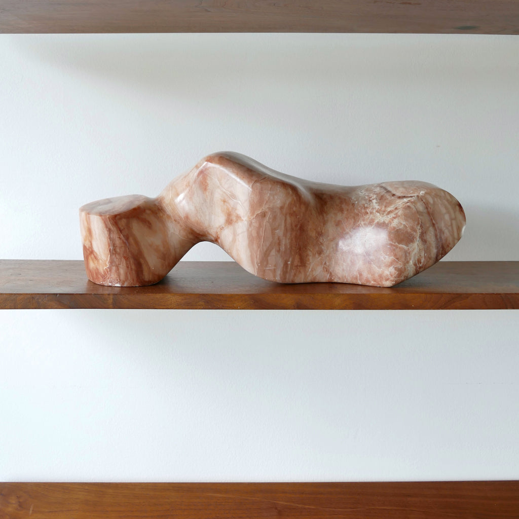 Large biomorphic sculpture made from pink marble. We see an abstract figure in repose, but another view may see something else.