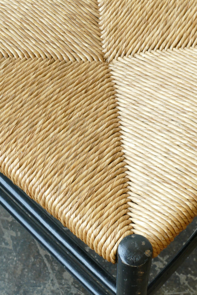 Structurally sound with some cosmetic imperfections. Rush seat fully intact. Retains original label.