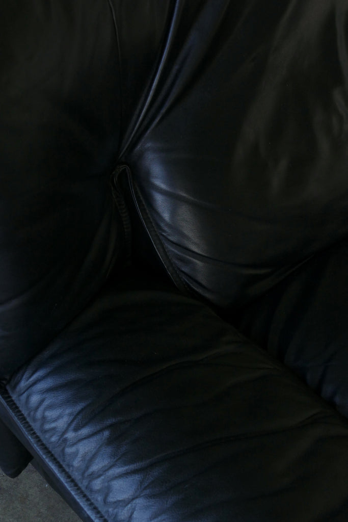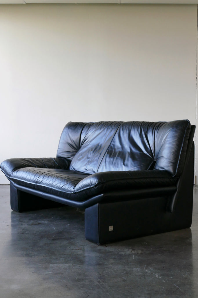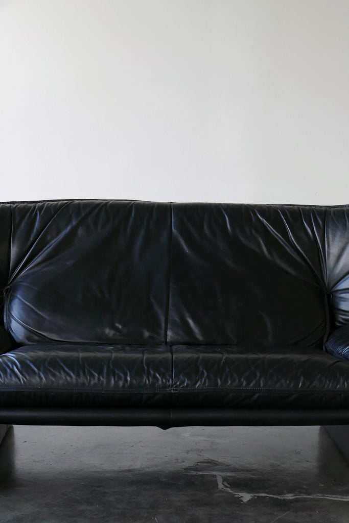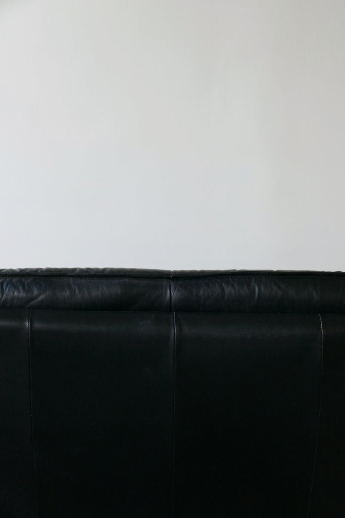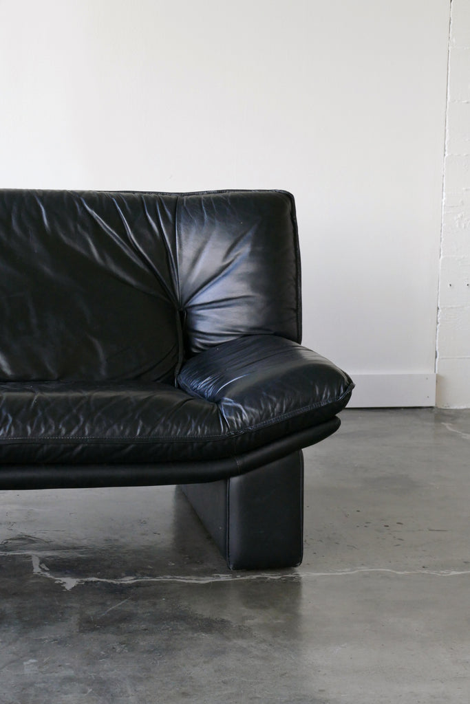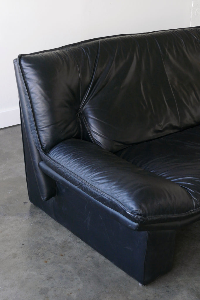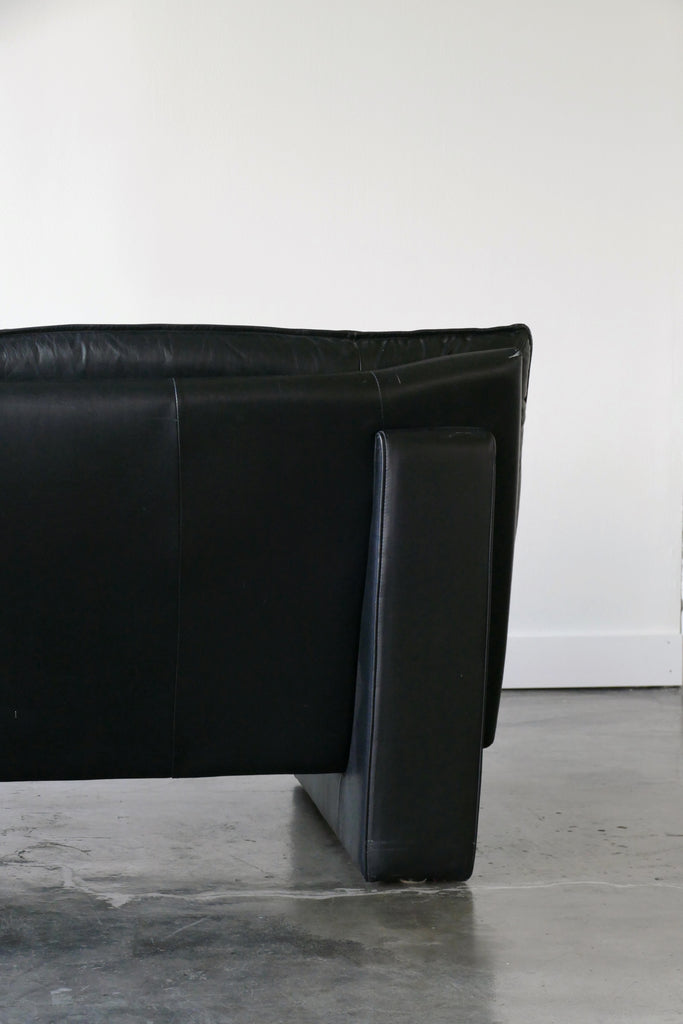 "Ambassador" loveseat by Nicoletti Salotti for Avanti, circa 1980s, Italy. A classic icon of postmodern furniture design, this loveseat is fully encased in supple black leather. Excellent vintage condition- age appropriate wear on seats, minor wear on seams. Comfortable and timeless.