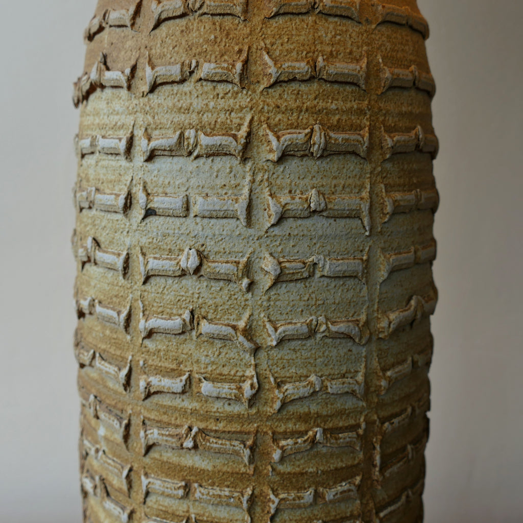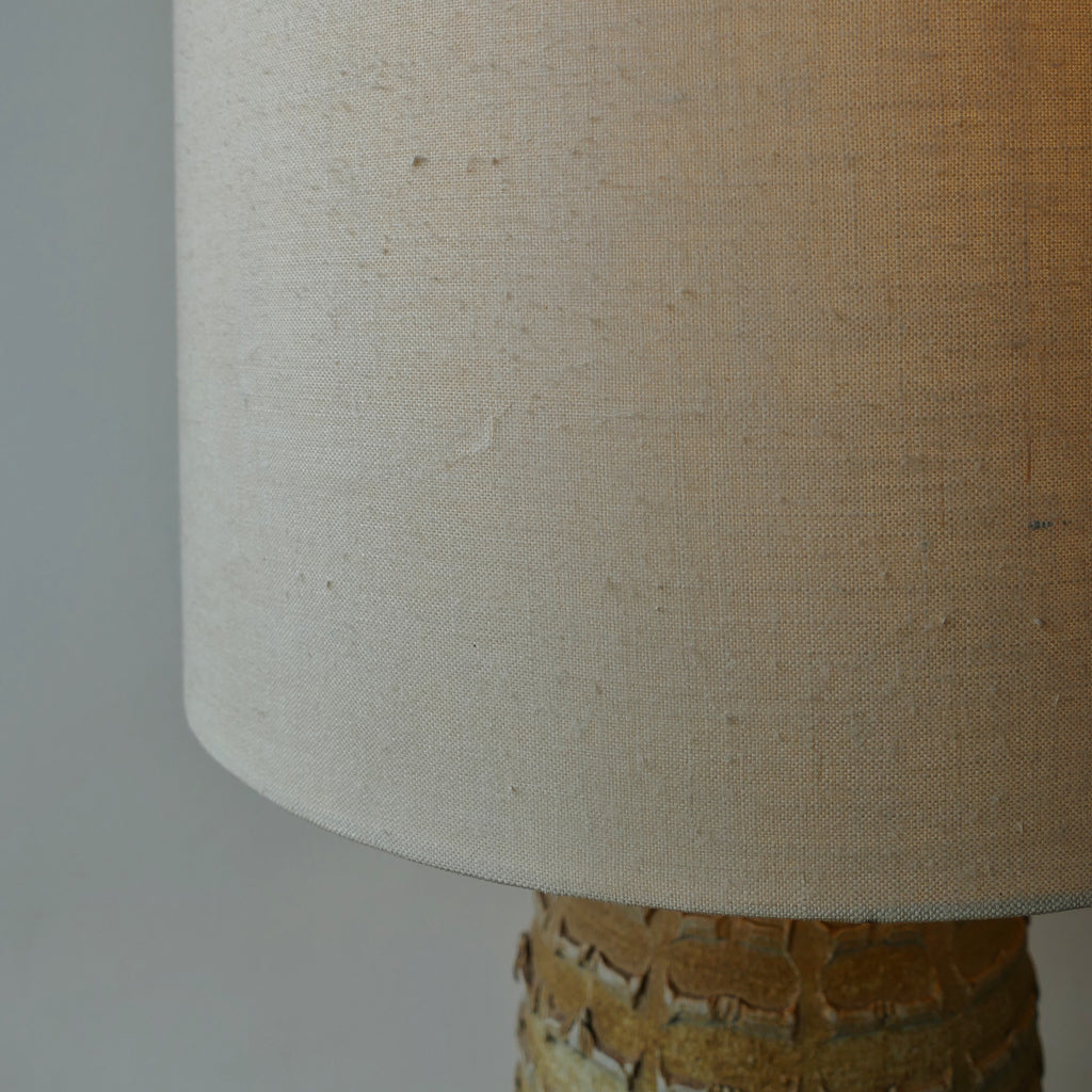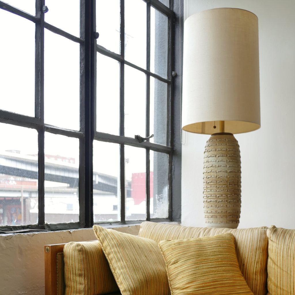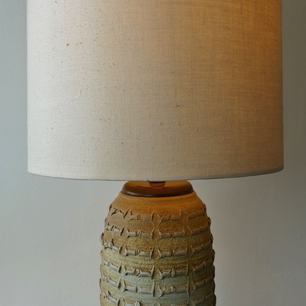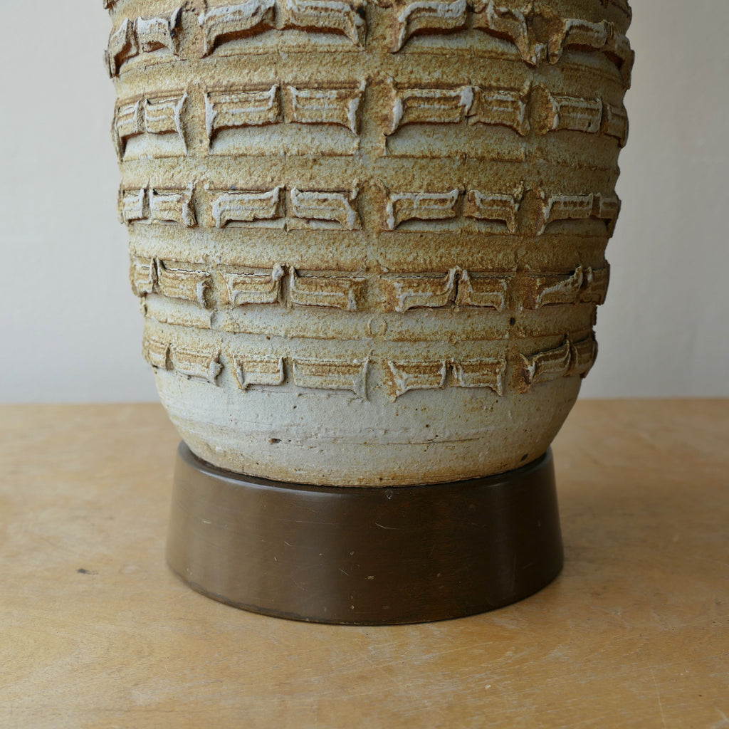 Large oversized mid century ceramic table lamp attributed to Bob Kinzie. Excellent vintage condition. Paired with age appropriate linen shade. Shade has one crack in interior plastic. A true statement piece for any room.