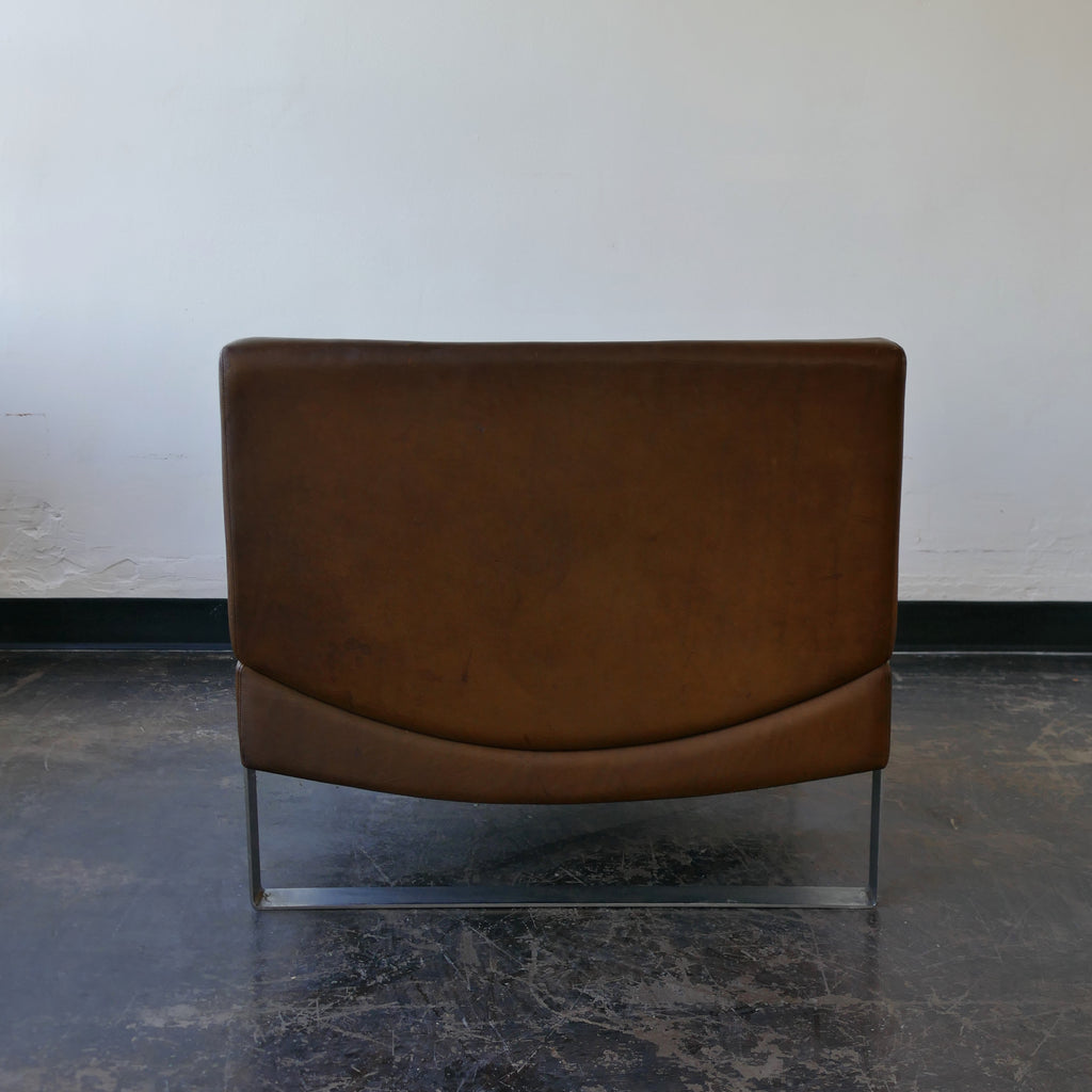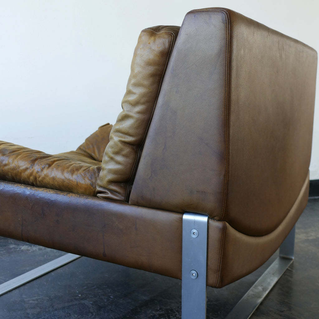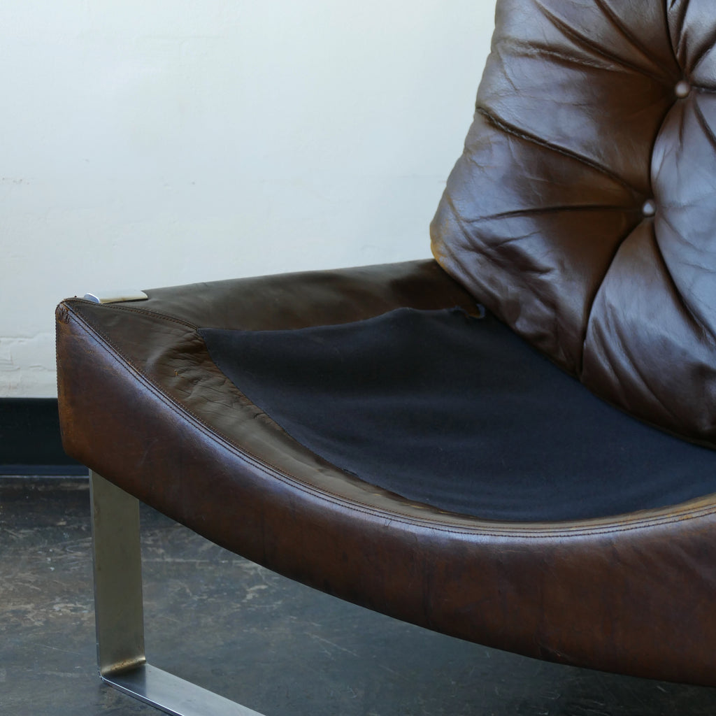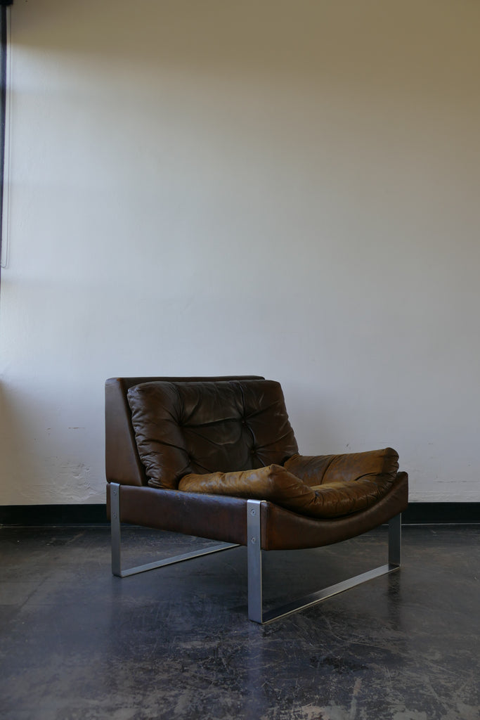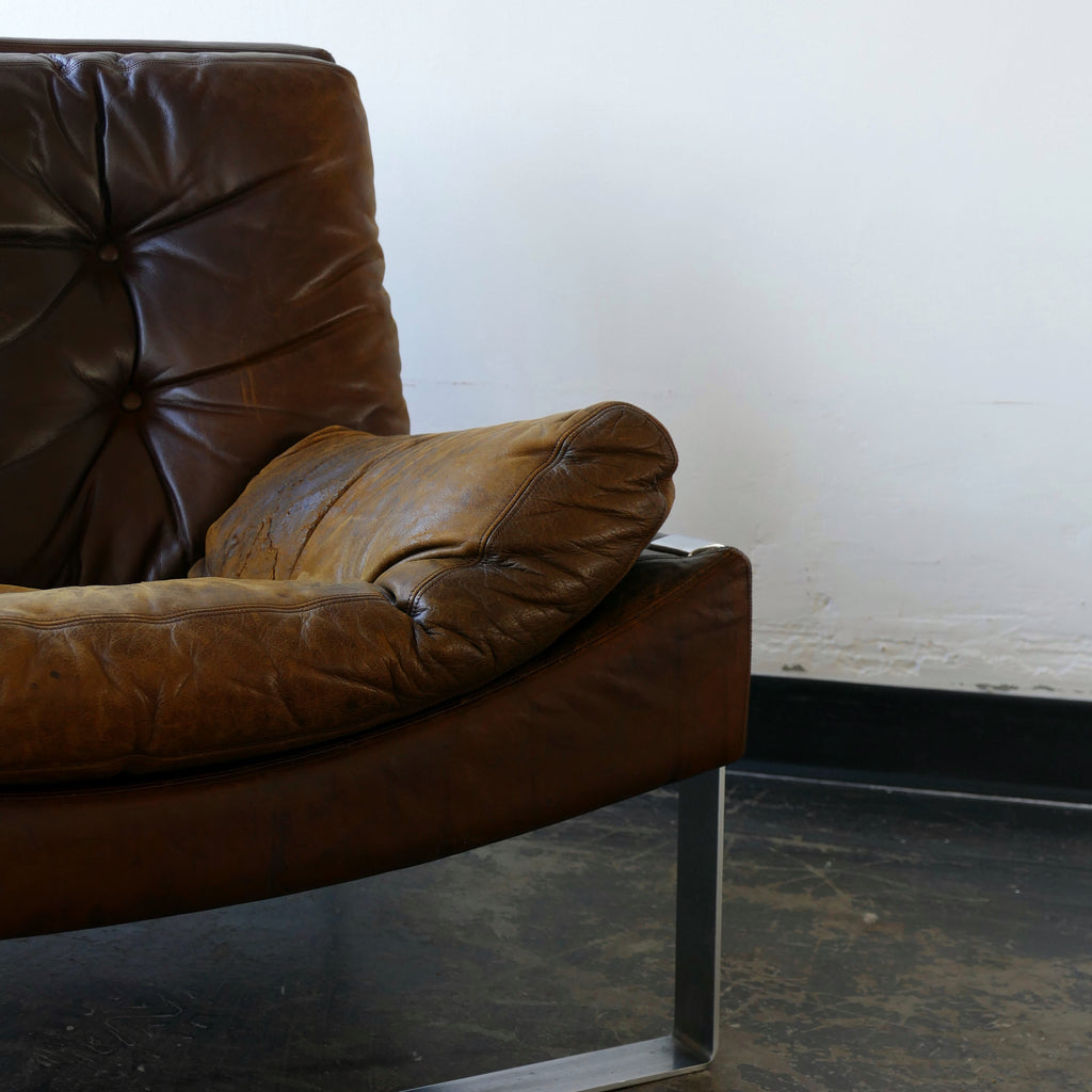 Incredible worn vintage brown leather lounge chair with tufted cushions supported by a brushed chrome frame. Significant patina on seat cushion with one patch repair (shown). A stunning addition to a room. Designer and manufacturer unknown.