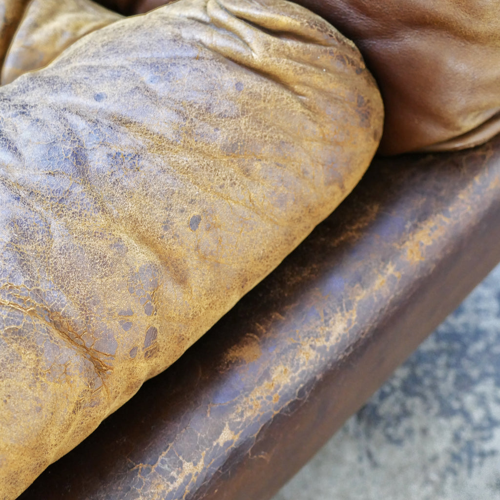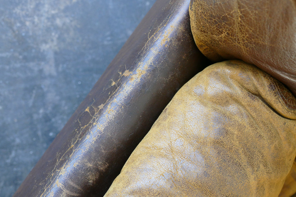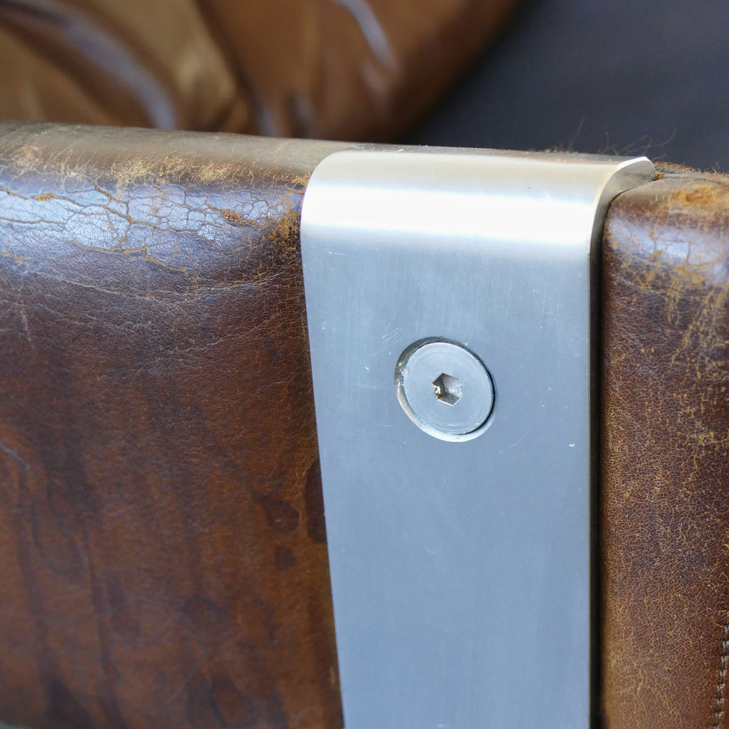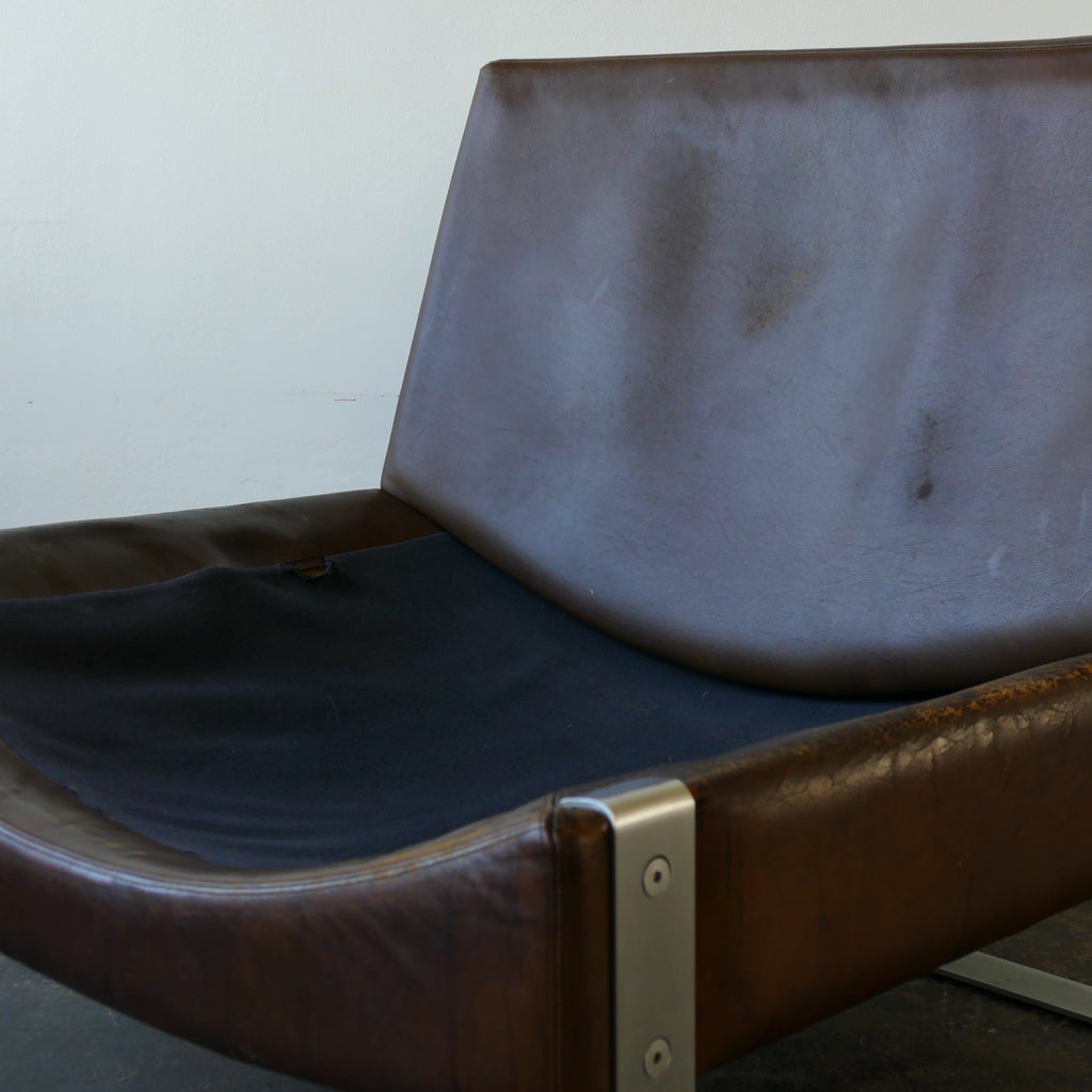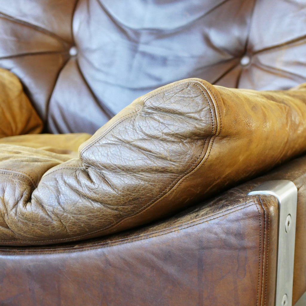Incredible worn vintage brown leather lounge chair with tufted cushions supported by a brushed chrome frame. Significant patina on seat cushion with one patch repair (shown). A stunning addition to a room. Designer and manufacturer unknown.