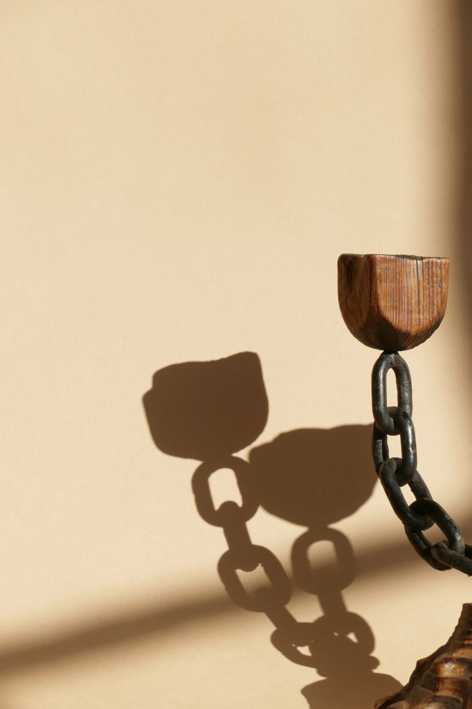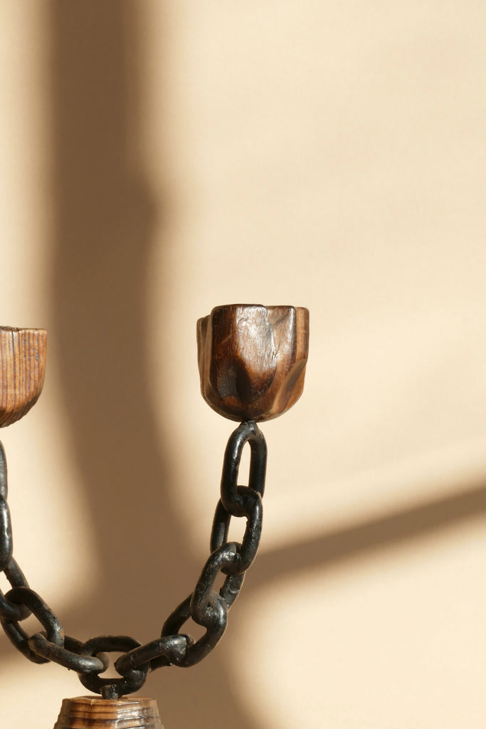 Spanish style Brutalist candlestick for two tapers, made from wood and metal chain. Excellent vintage condition.