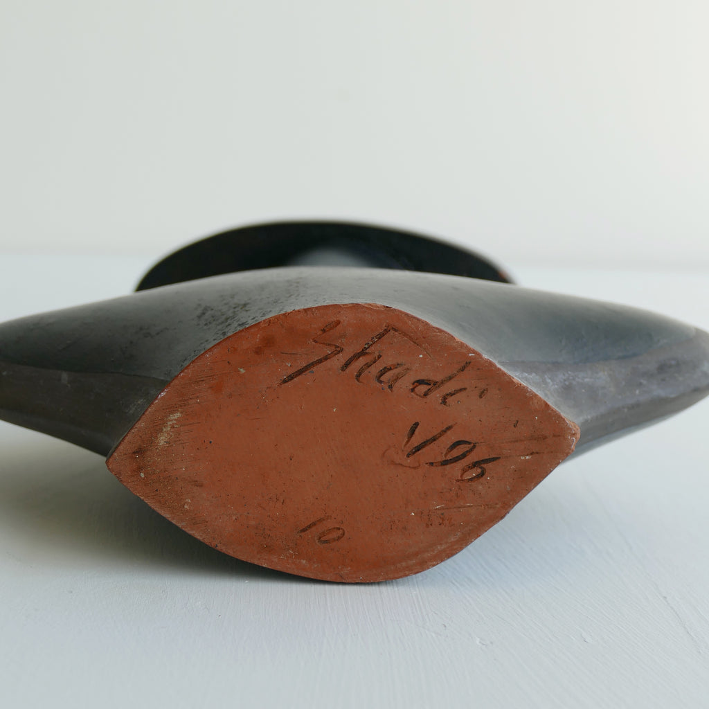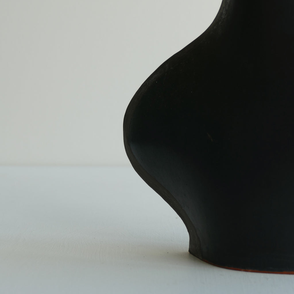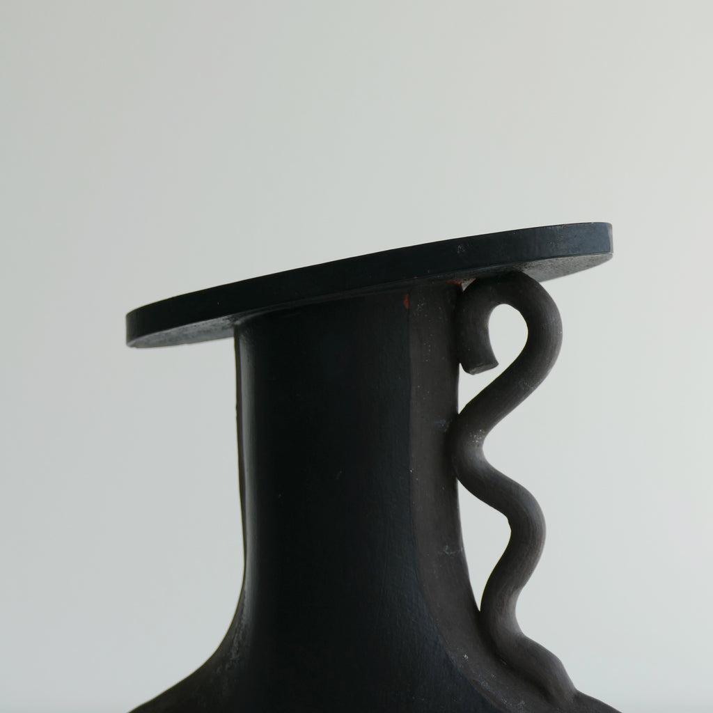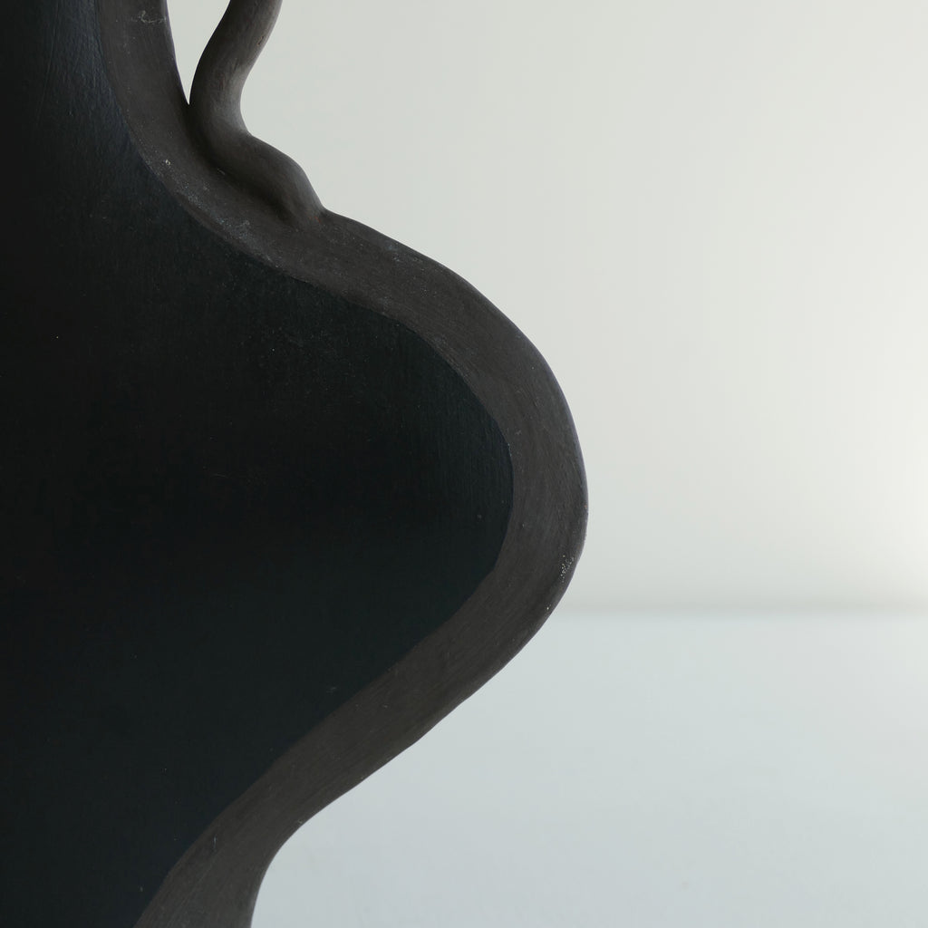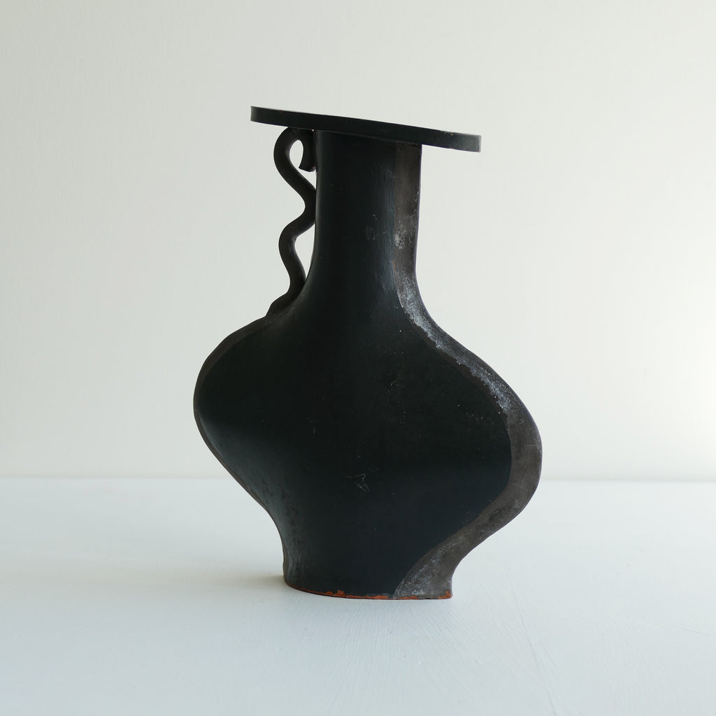 Post modern terra cotta vase painted black with gray detail. Asymmetrical top and squiggle handle. Small chips/touch ups as shown. Good vintage condition.