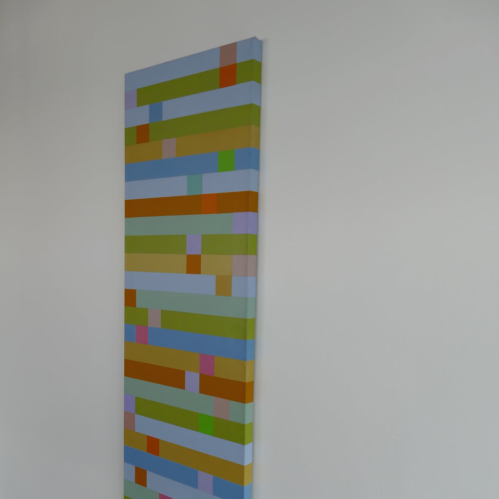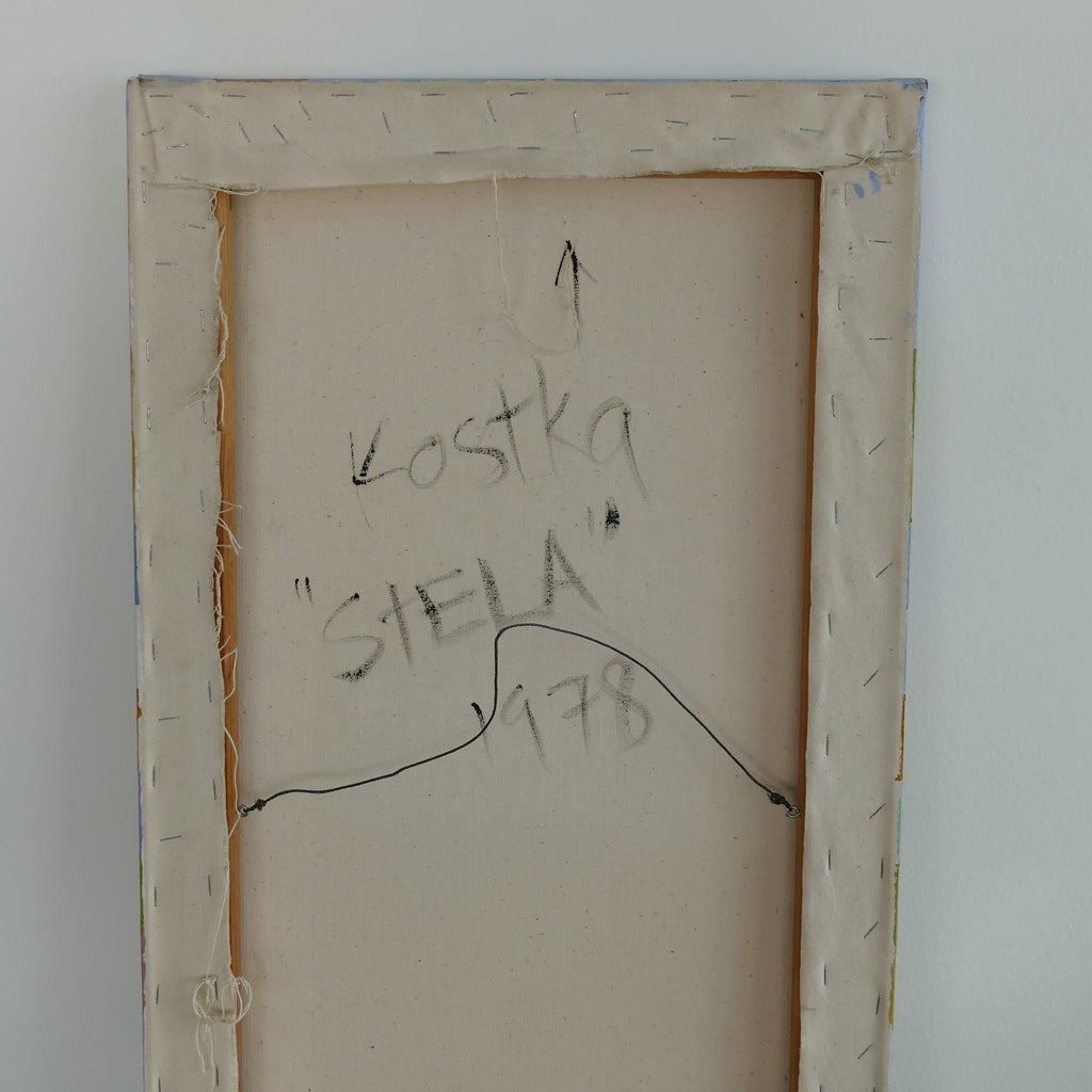 Just in time for spring, this beautiful hard edge color block will brighten any hallway or room in your home! Painted in 1978 by a Reed College engineering professor. Titled "Stela." Paint on canvas; wrapped frame. Excellent condition; minor scuffs.
