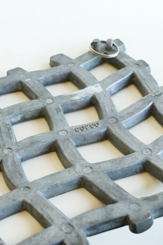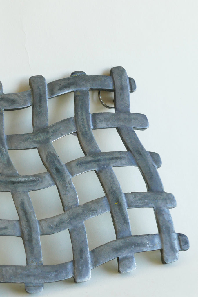 Vintage woven aluminum footed trivet by Copco. All over patina, attached ring for hanging.