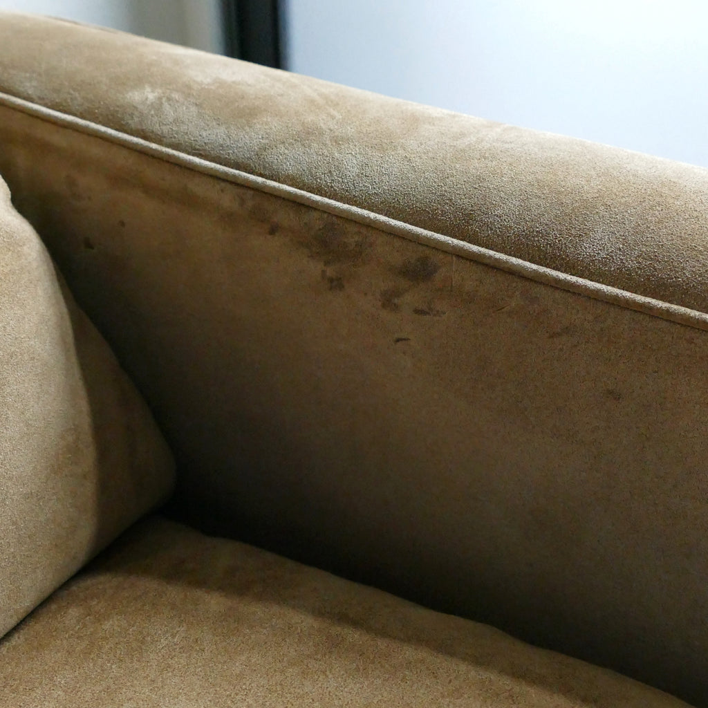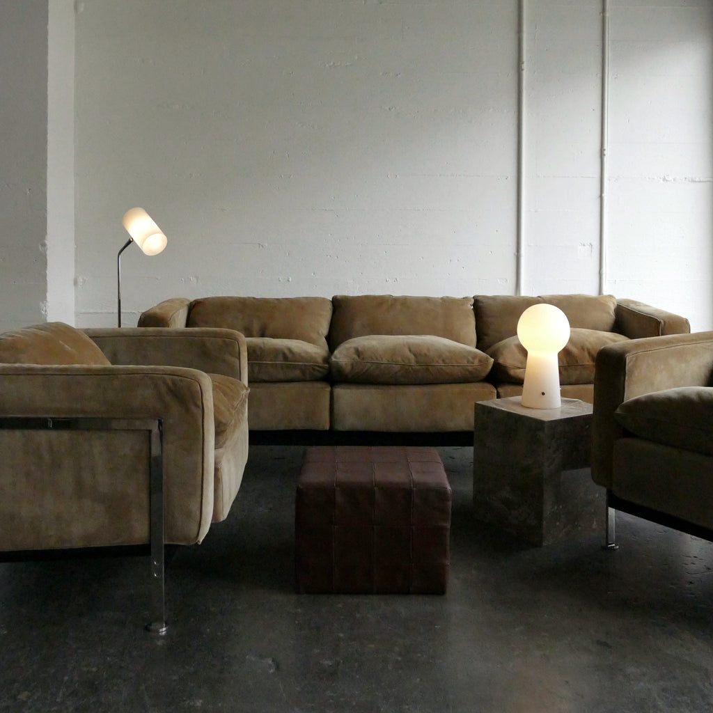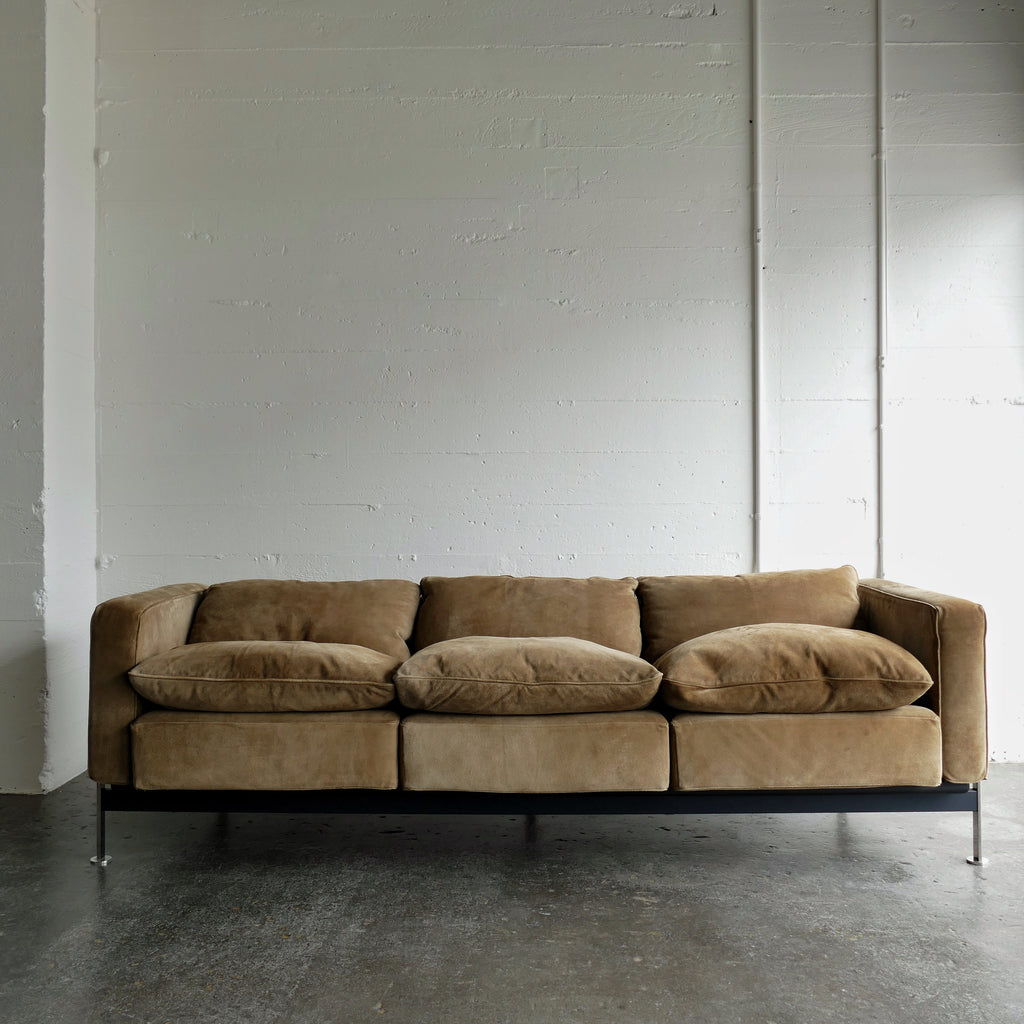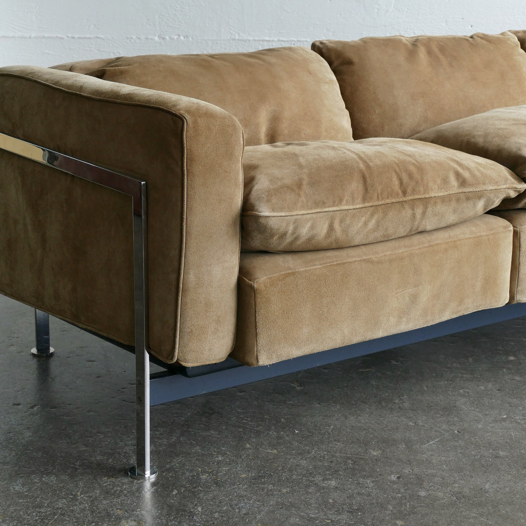 Steel frame, down pillows, suede. 33.5"W x 29.5"D x 25"H, seat 18"H