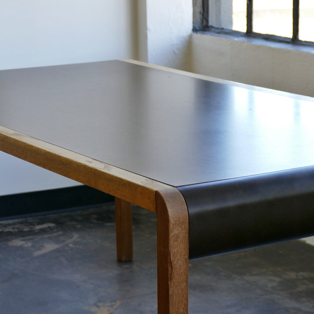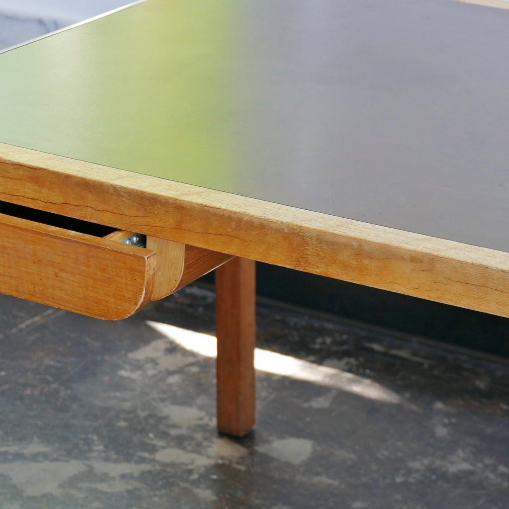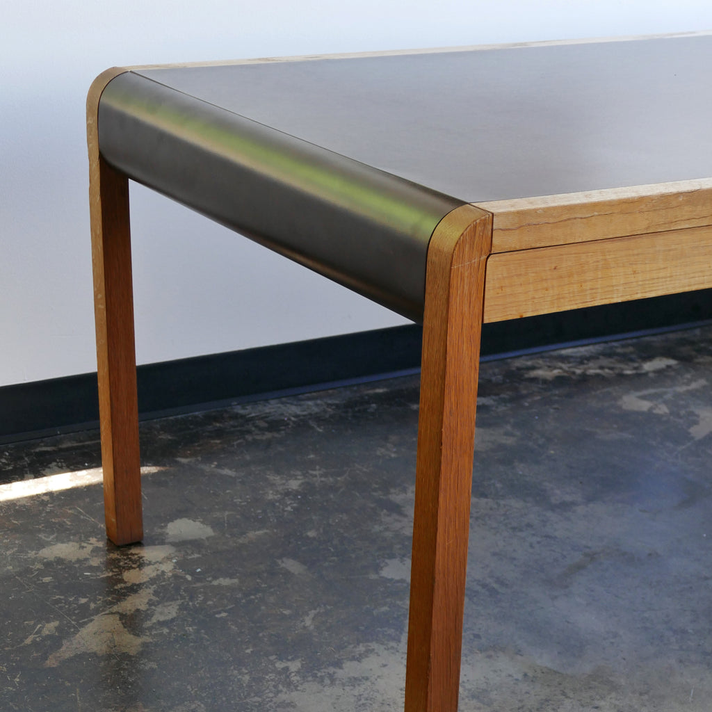 Large oak bentwood desk with chocolate brown laminate top. Two working drawers. Overall very good vintage condition. Some sun fading and light cracking as shown. Priced accordingly. Would be great as a desk, cashwrap/check out, workspace for an artist, etc. Heavy!
