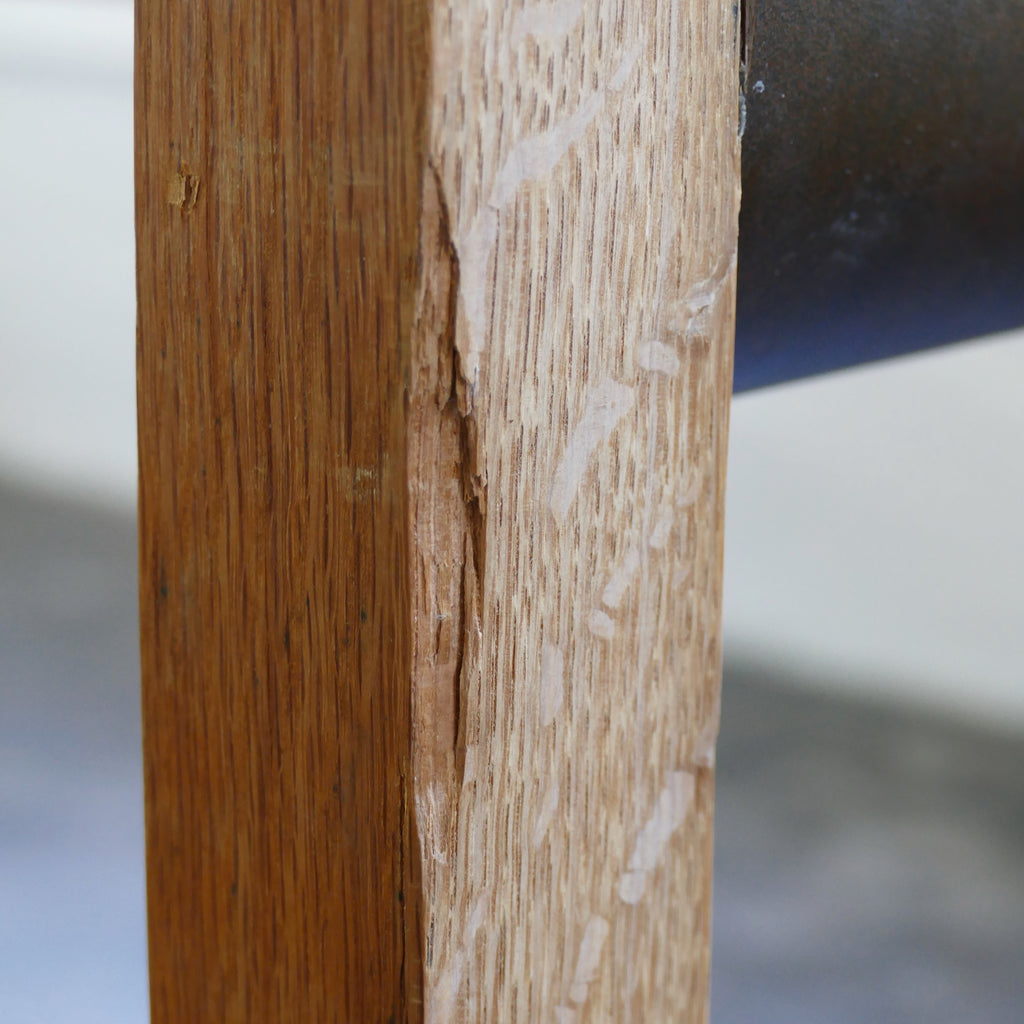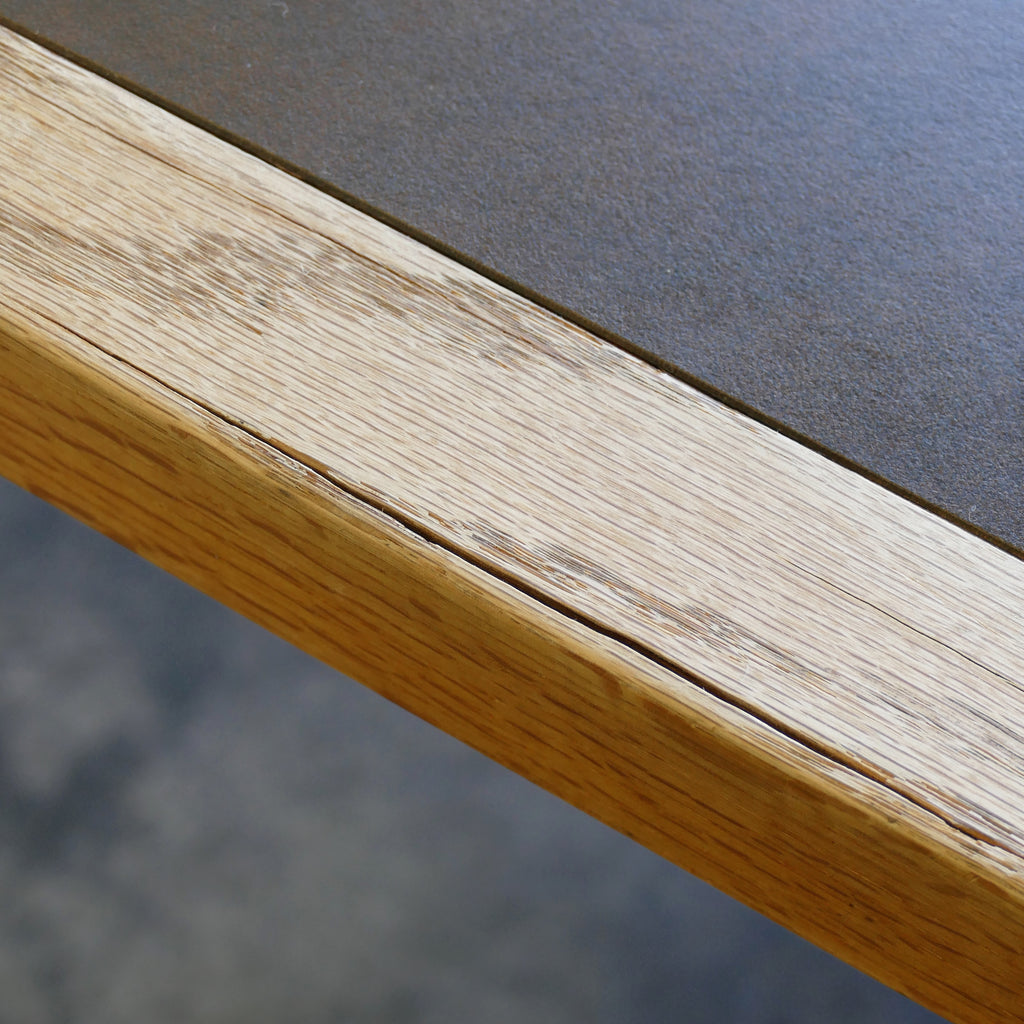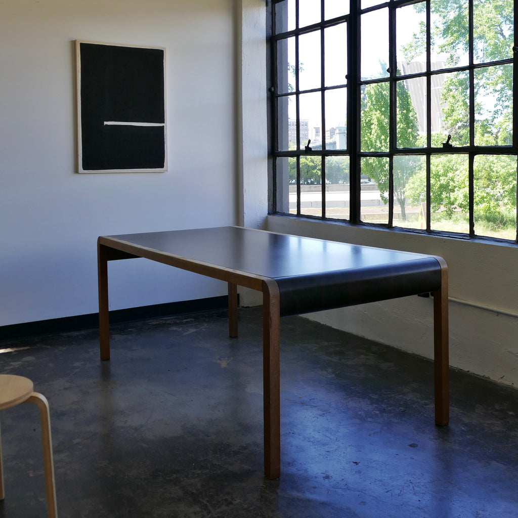 Large oak bentwood desk with chocolate brown laminate top. Two working drawers. Overall very good vintage condition. Some sun fading and light cracking as shown. Priced accordingly. Would be great as a desk, cashwrap/check out, workspace for an artist, etc. Heavy!