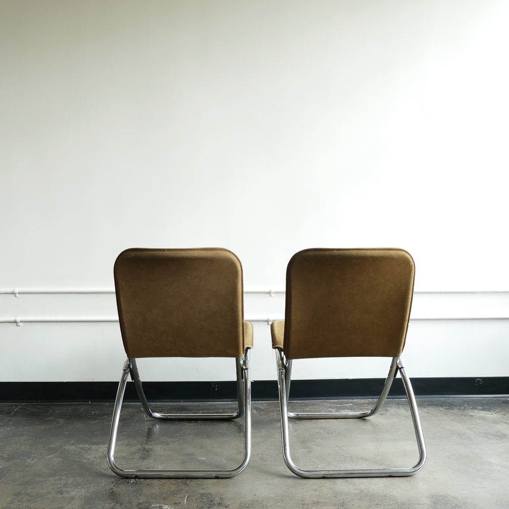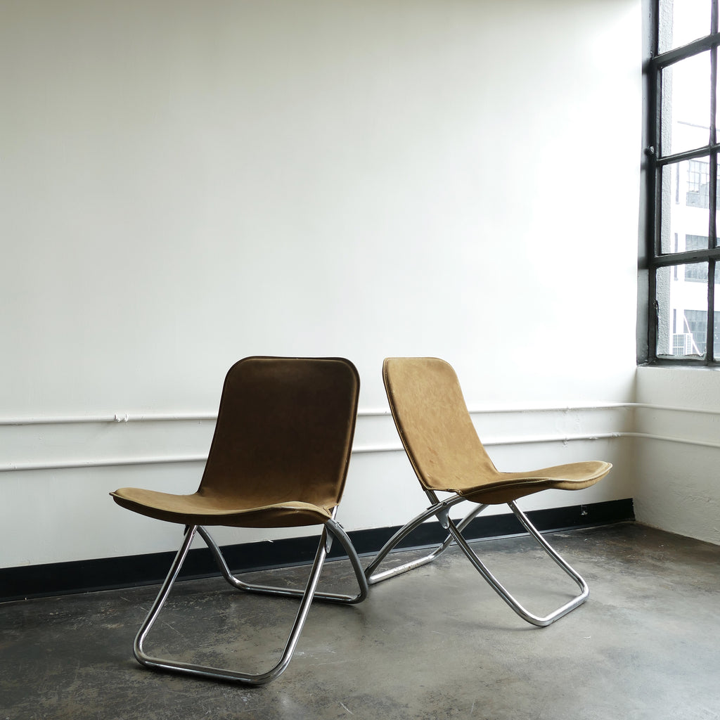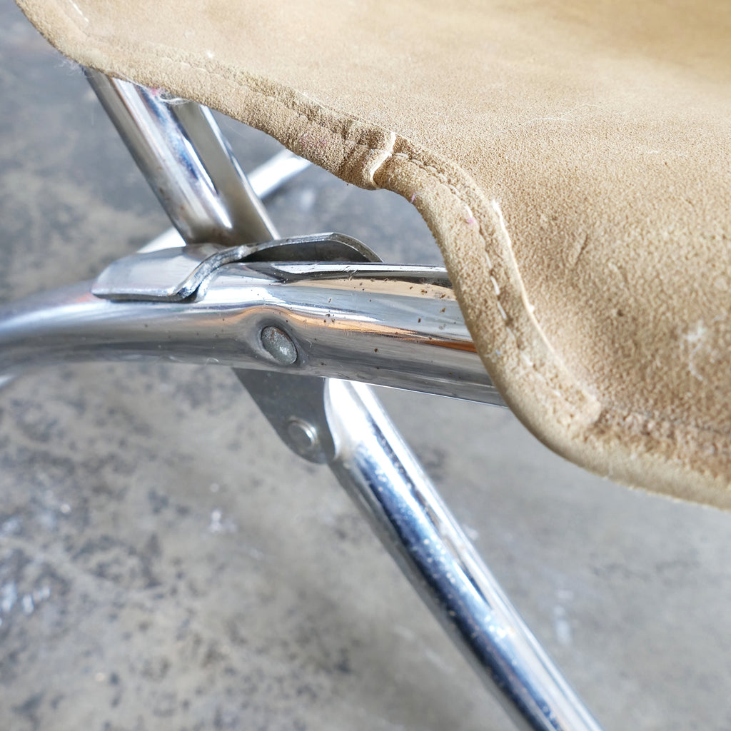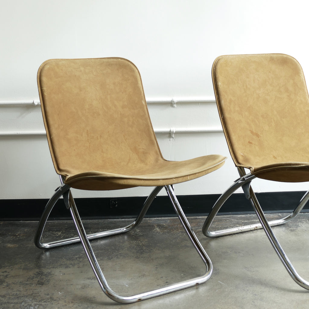 Very cool mid century chrome folding chairs with faux suede seats. Designer unknown. Structurally sound and functional. Some light pitting on frames and some damage to material, as shown. In this case, the patina on these add to their character.