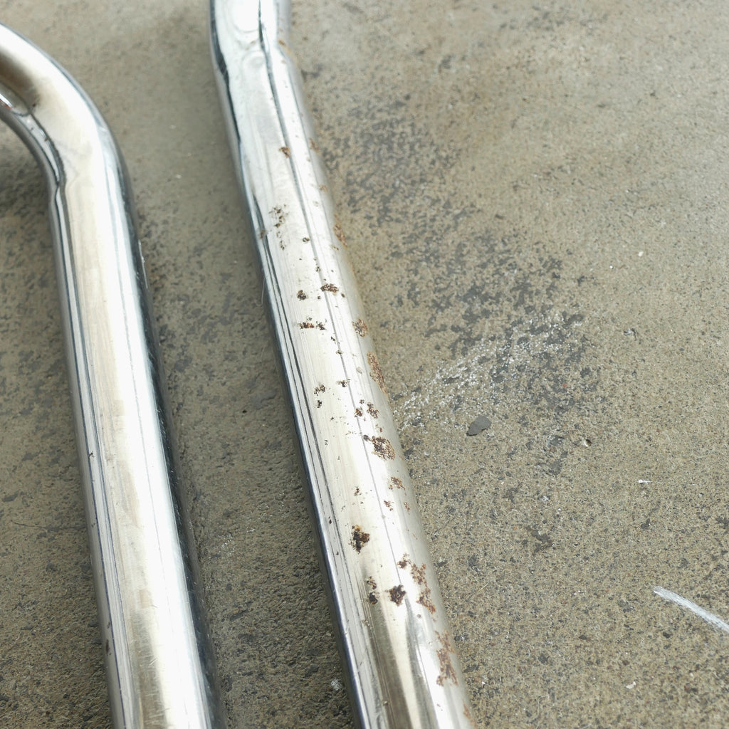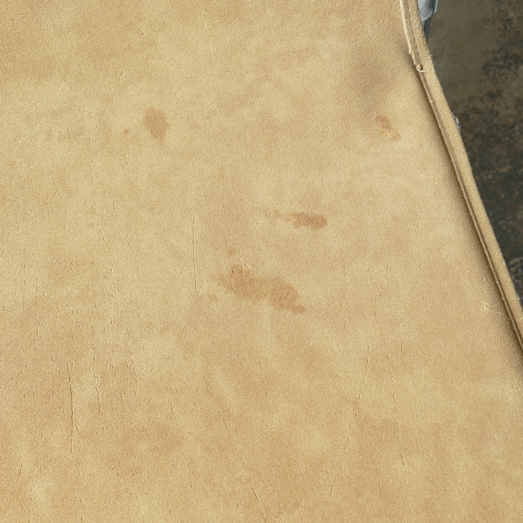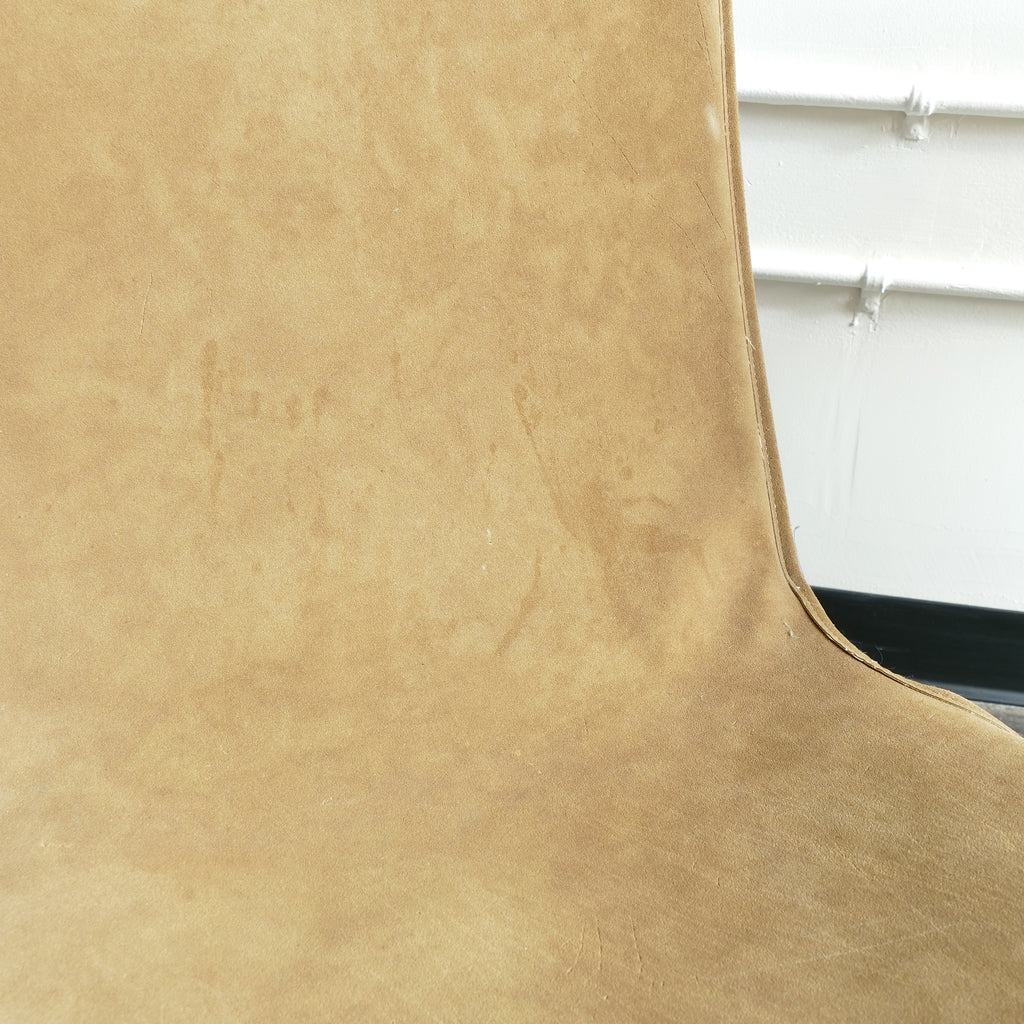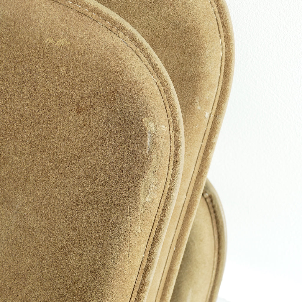 Very cool mid century chrome folding chairs with faux suede seats. Designer unknown. Structurally sound and functional. Some light pitting on frames and some damage to material, as shown. In this case, the patina on these add to their character.