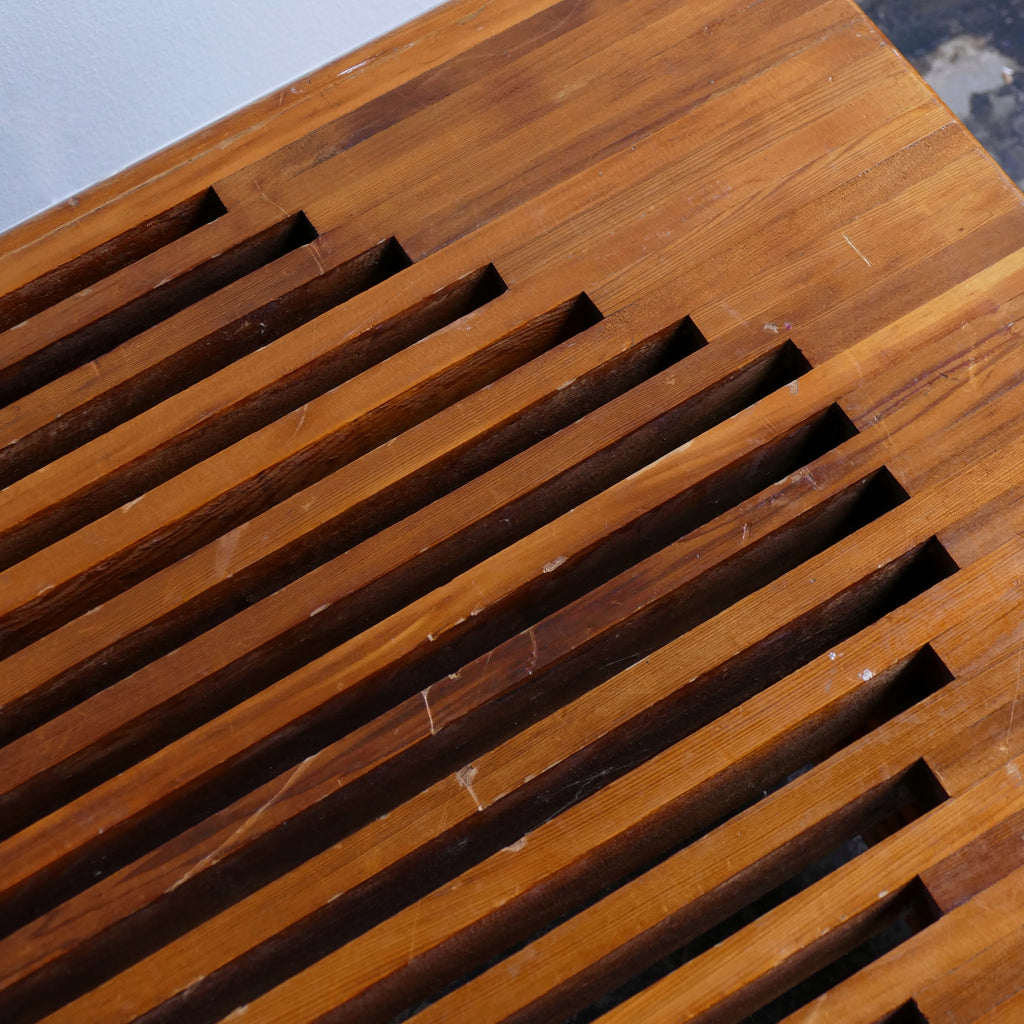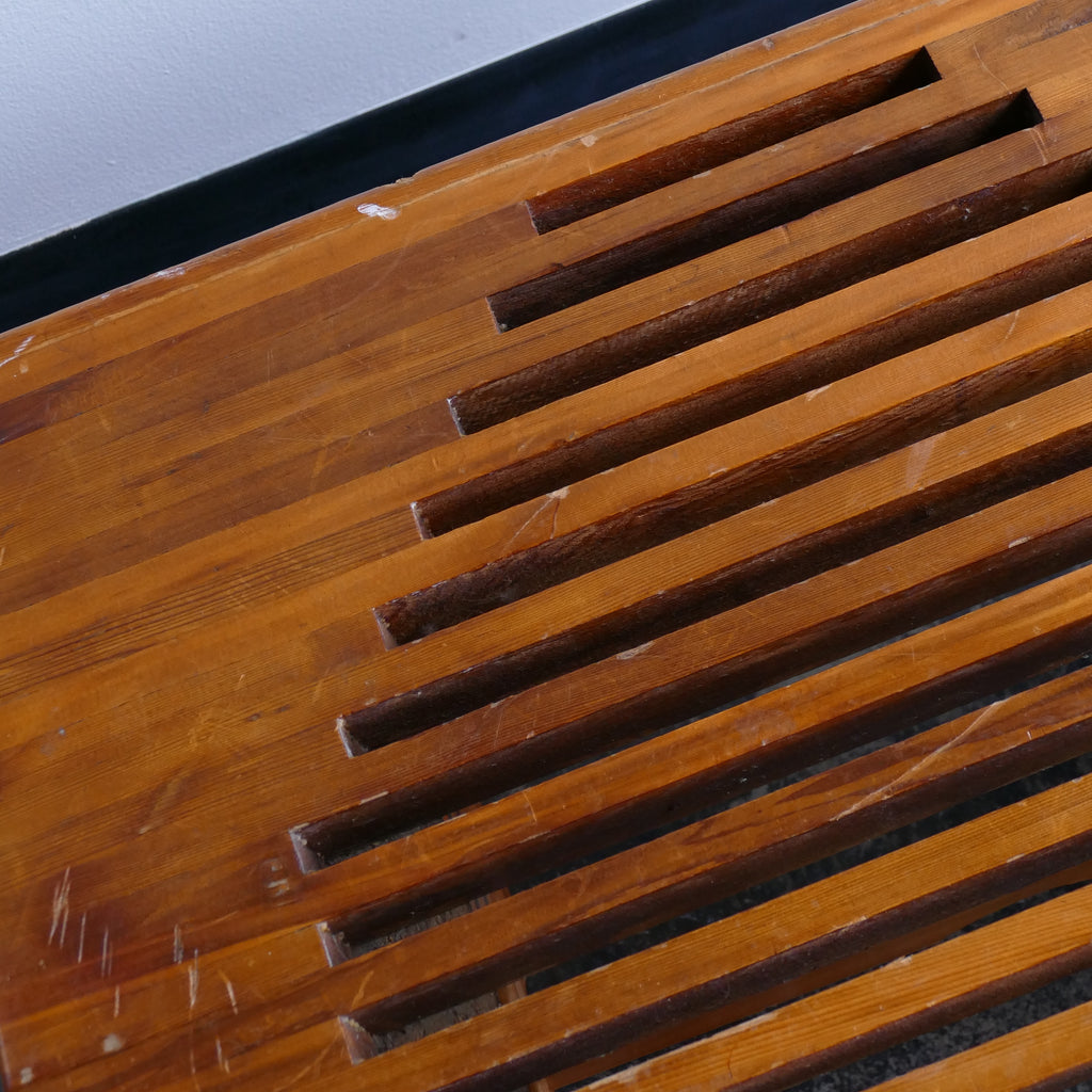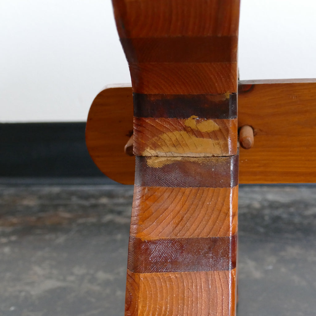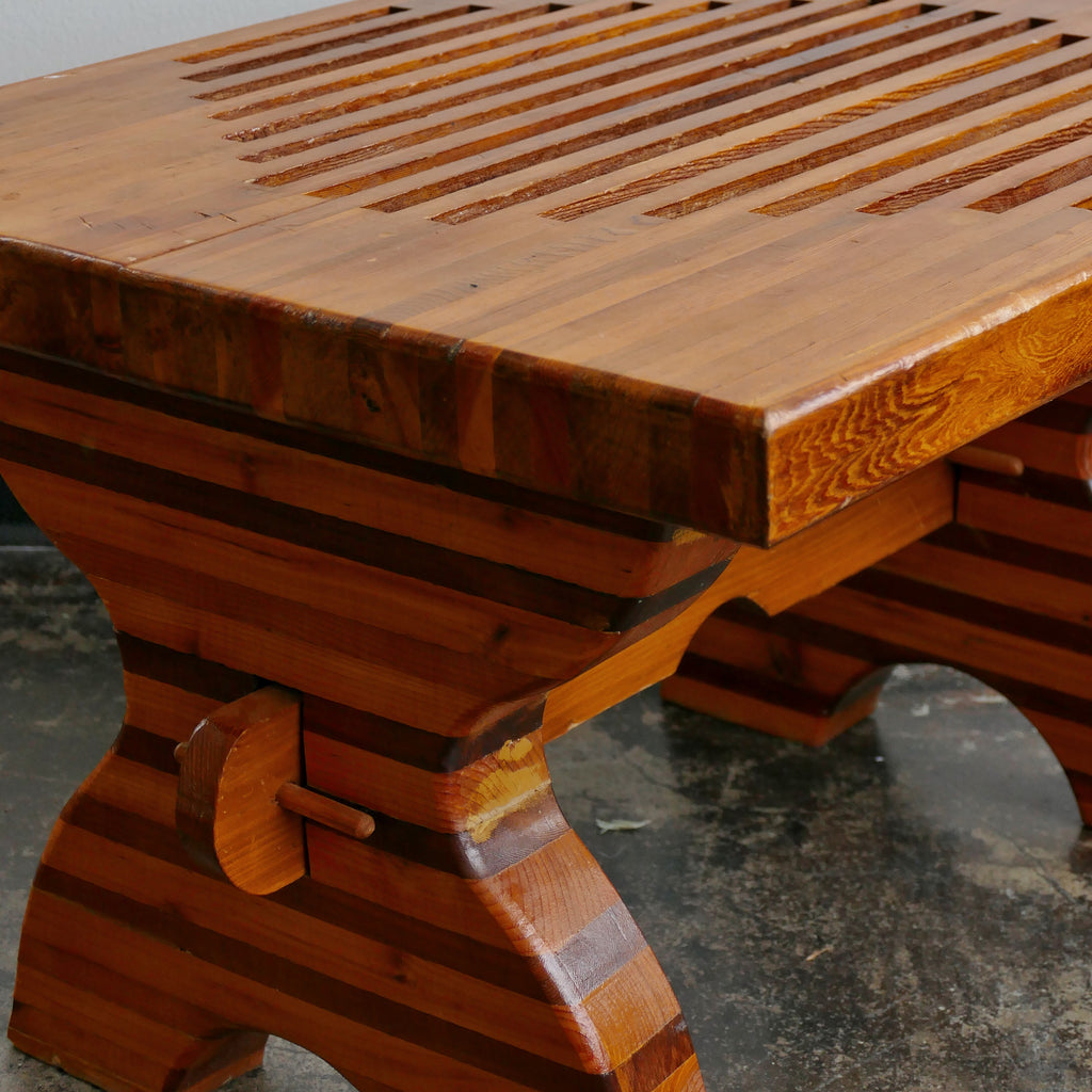 Stack laminated folk art side or small coffee table. One of a kind. Trestle base with geometric design on top and overall unique and stimulating design. Likely maple and fir. Minor wear on top as shown, one chip on edge.
