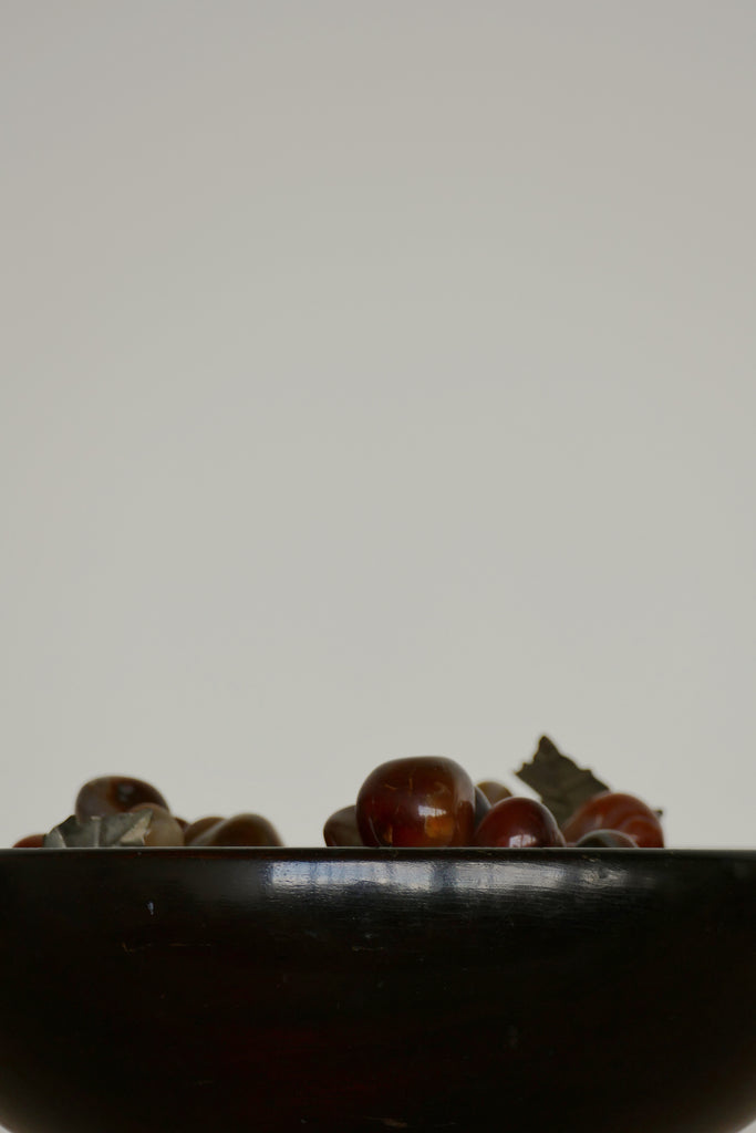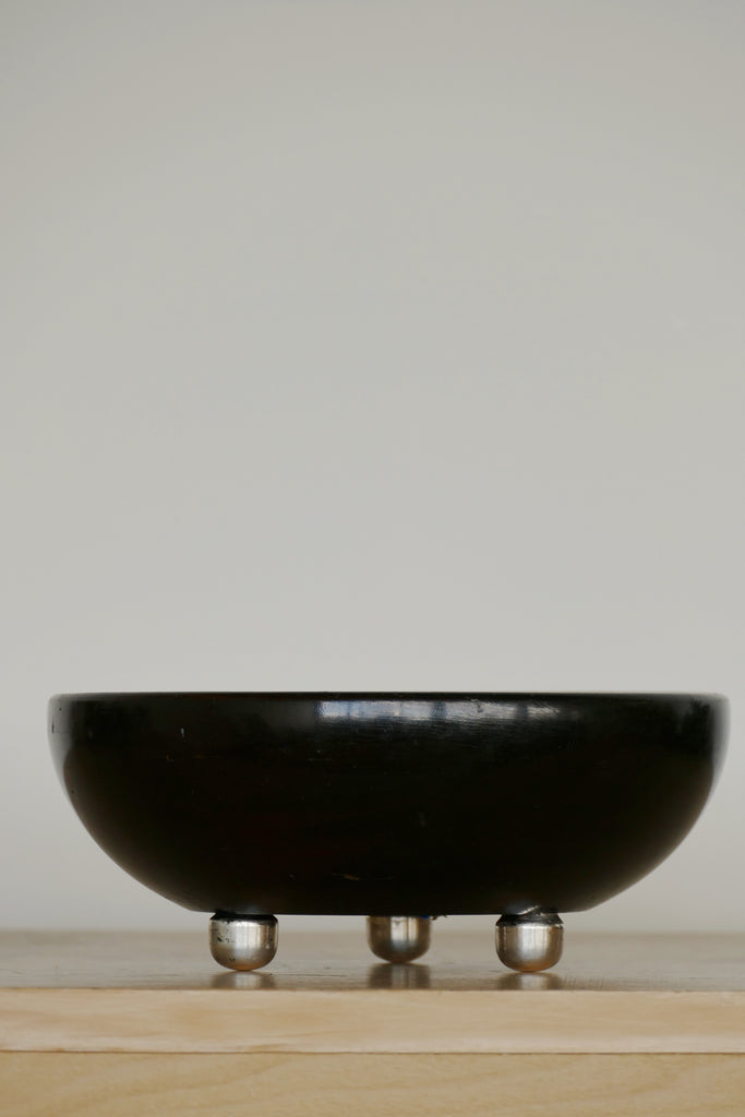 Vintage wood bowl with three knobby chrome feet, creating the perfect balance between natural and luxe. We loved it filled with our vintage stone grapes, or some other sort of contrasting material. Some minor age appropriate nicks in stain.
