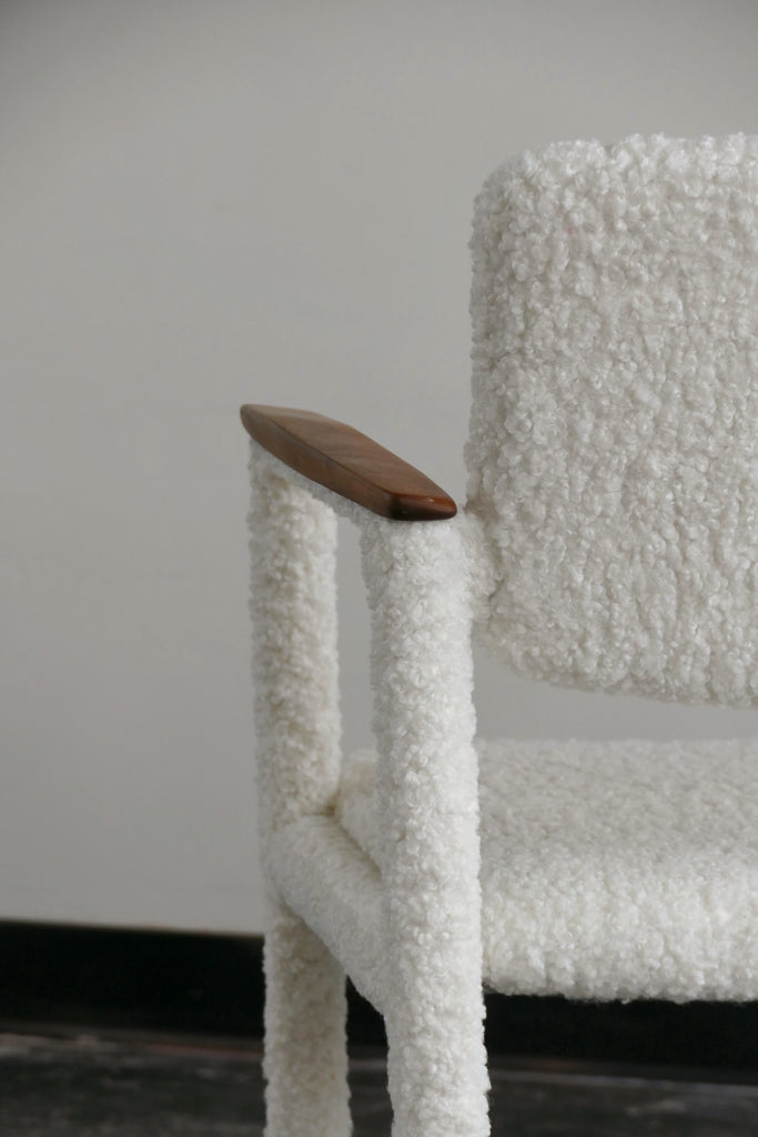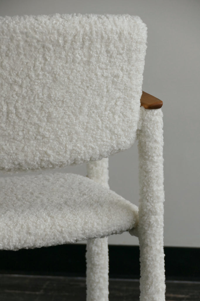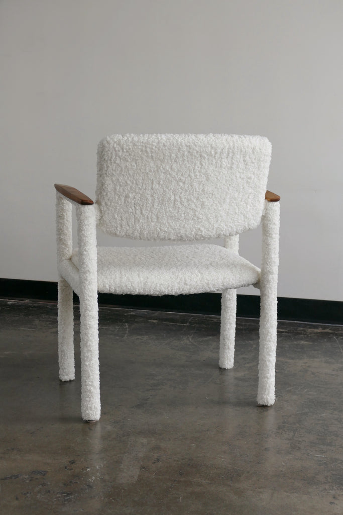 One of a kind, fully bouclé covered experiment project chair by local Portland upholsterer Joe Benassi. A piece of functional art that is lovingly being referred to as Fuzzy Wuzzy.