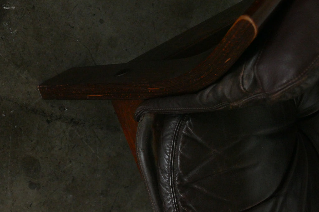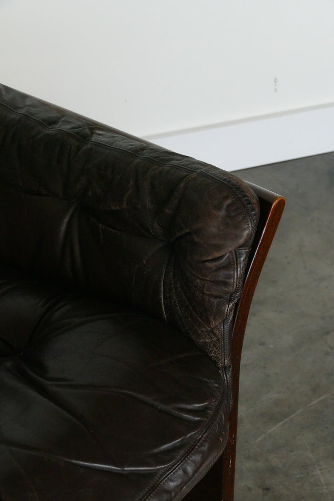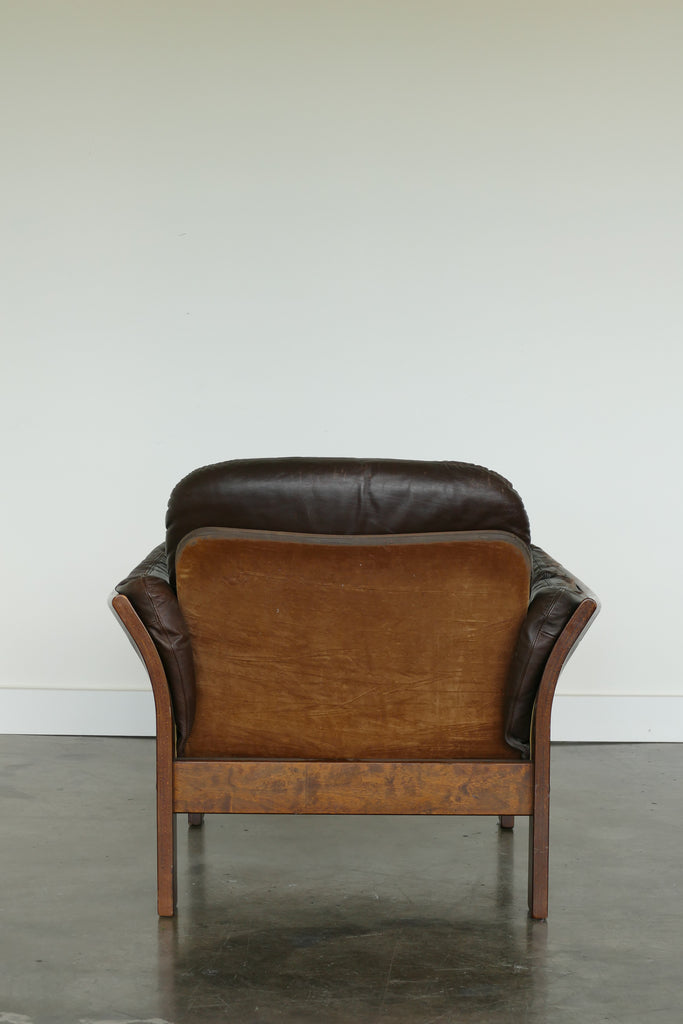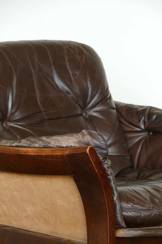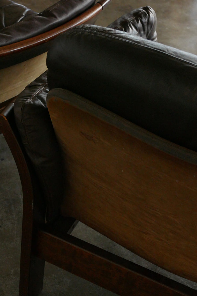 Handsome chocolate leather and wood armchairs by Danish designer Georg Thams, circa 1950s-1960s. All over age appropriate patina on removable leather cushions. Extremely comfortable; condition is reflected in photos. Sold individually.