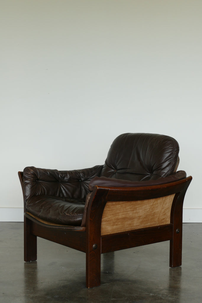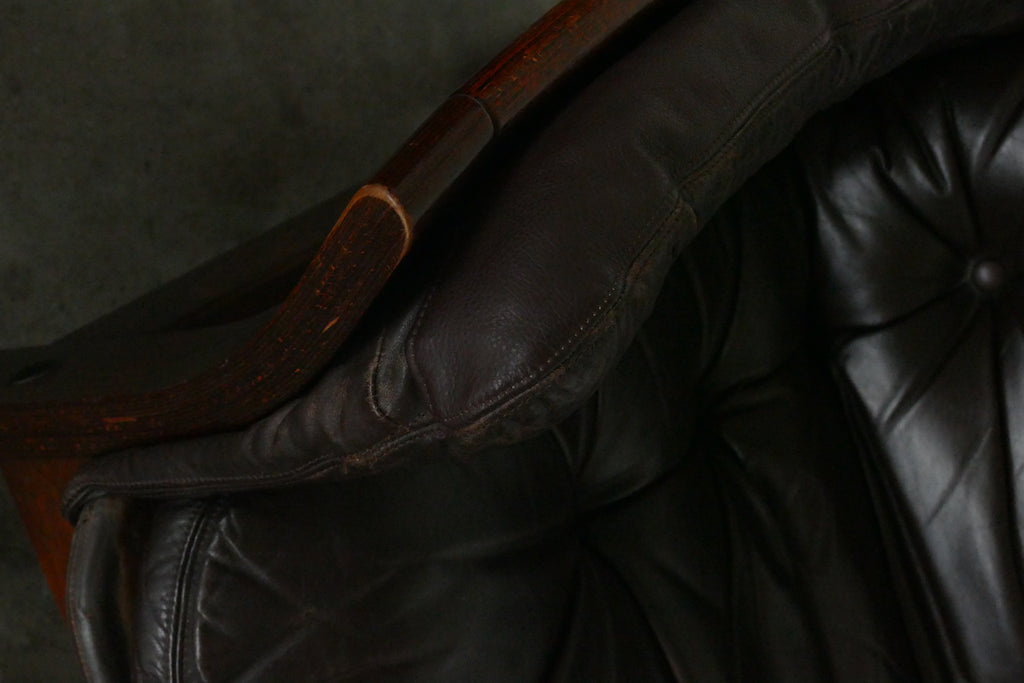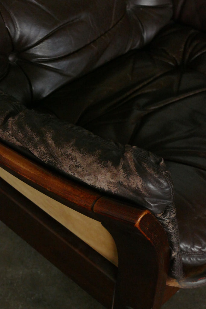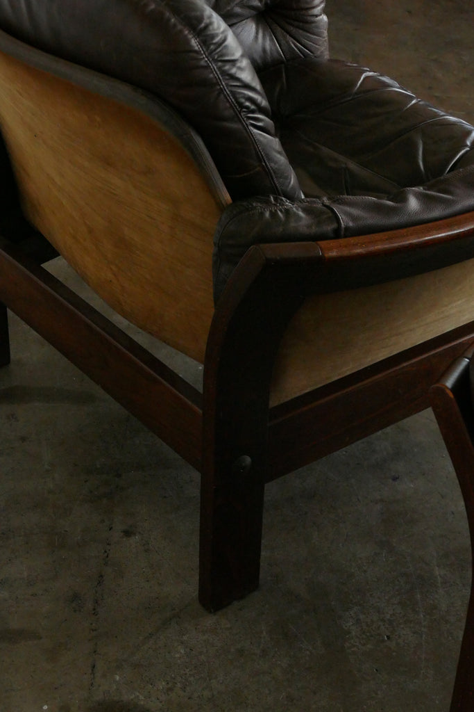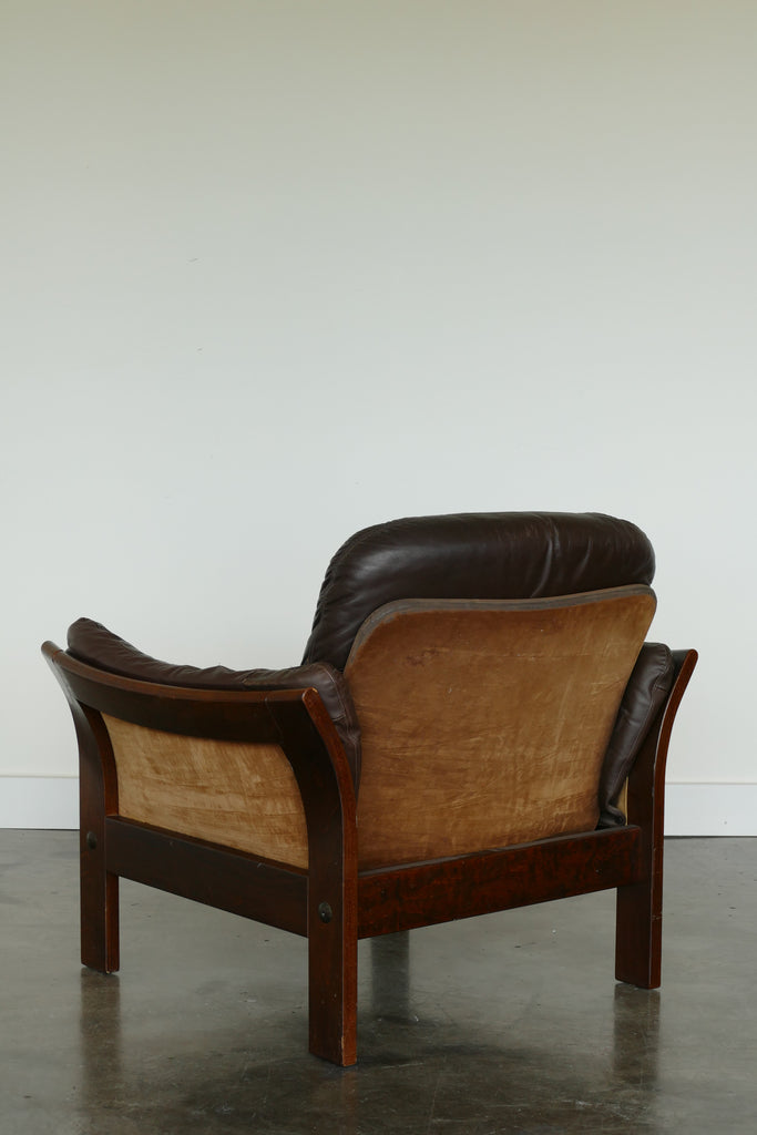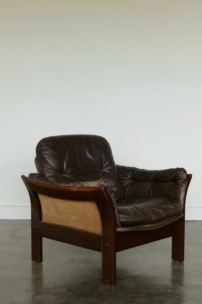 Handsome chocolate leather and wood armchairs by Danish designer Georg Thams, circa 1950s-1960s. All over age appropriate patina on removable leather cushions. Extremely comfortable; condition is reflected in photos. Sold individually.