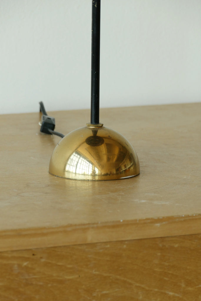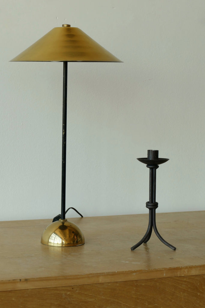 Sleek vintage mid century brass table lamp with weighted base and cone shade. Light wear.