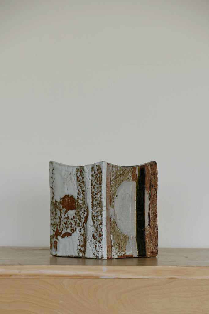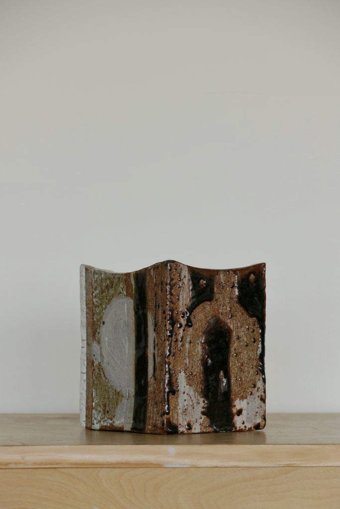 Fabulous vintage square planter / open box with shades of brown glaze in an all over graphic pattern.