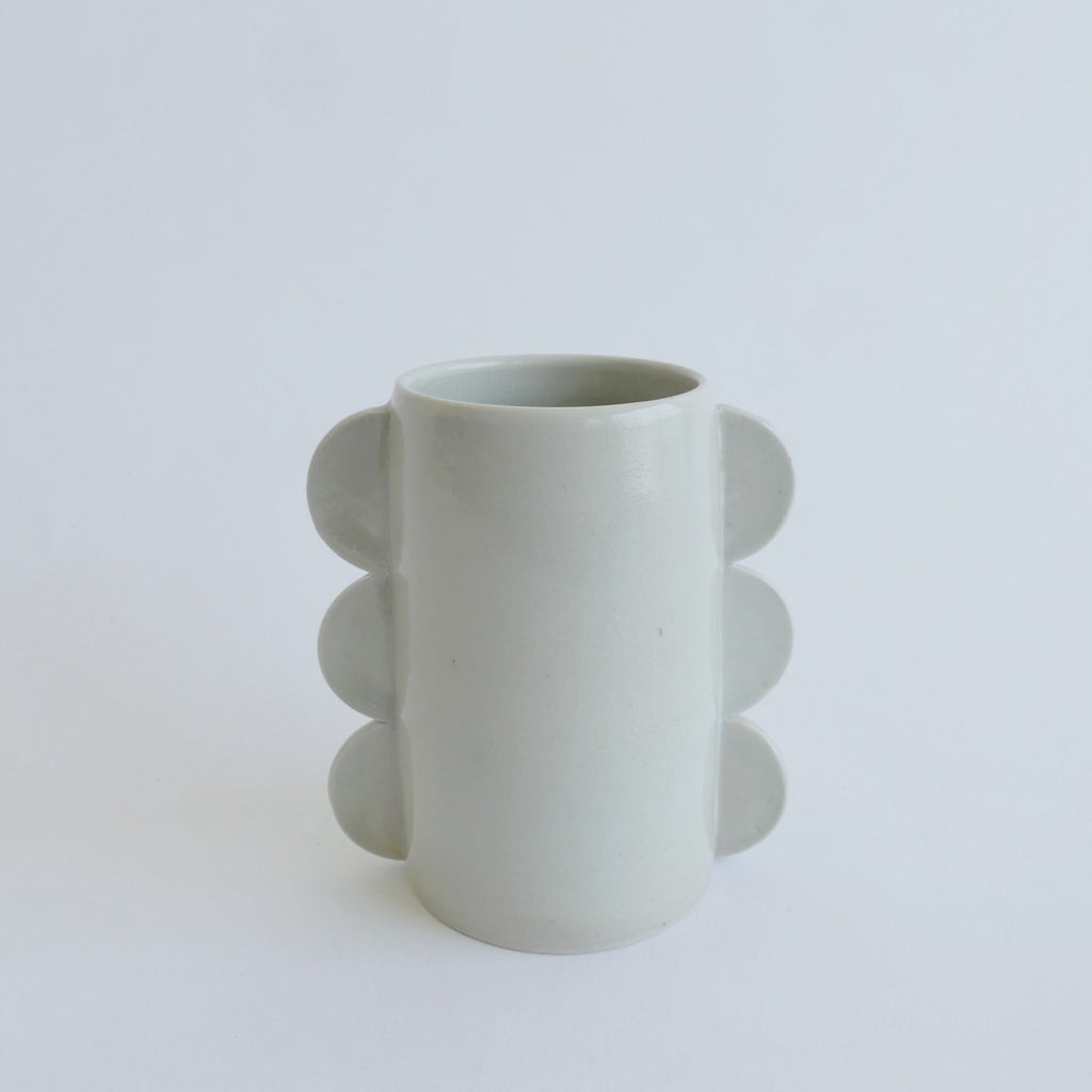 Sweet glossy gray vase with semicircle handle details, by Martie Kilmer.