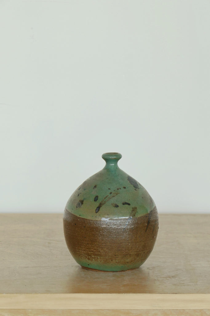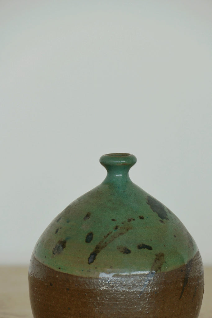 Nice weedpot in a lesser seen glossy green glaze with blackish brown detail.