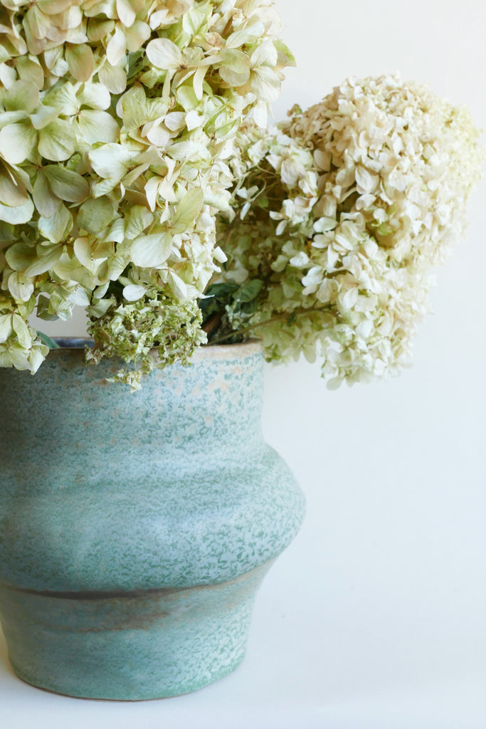Large wonky handmade vase in muted seafoam green with a dark maroon interior. Excellent condition.