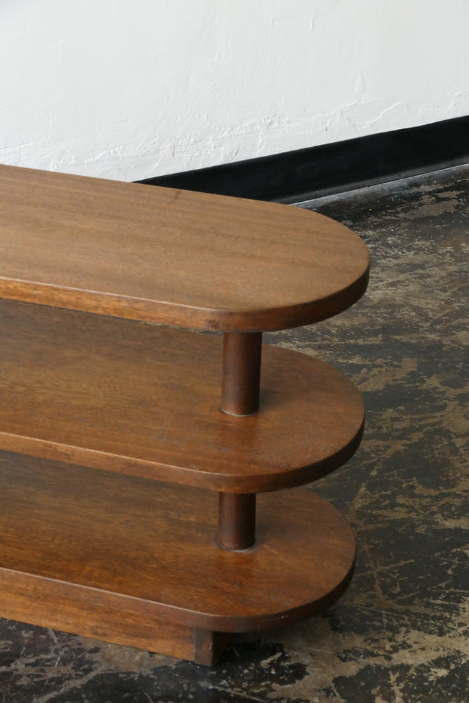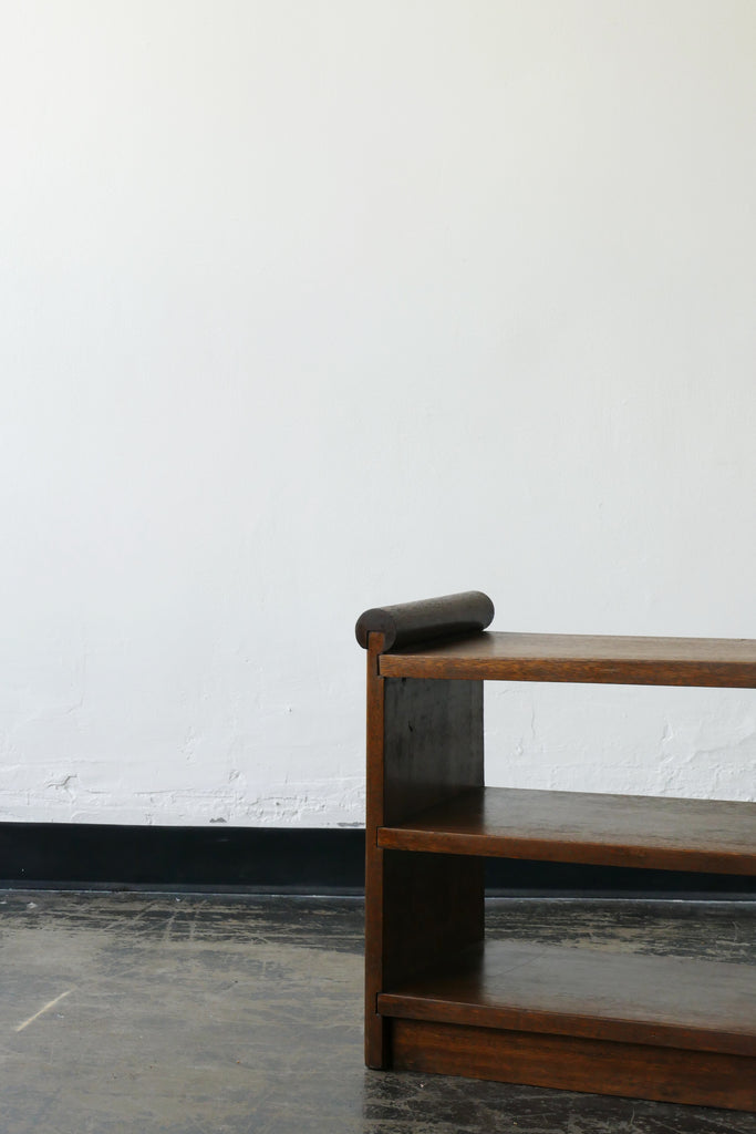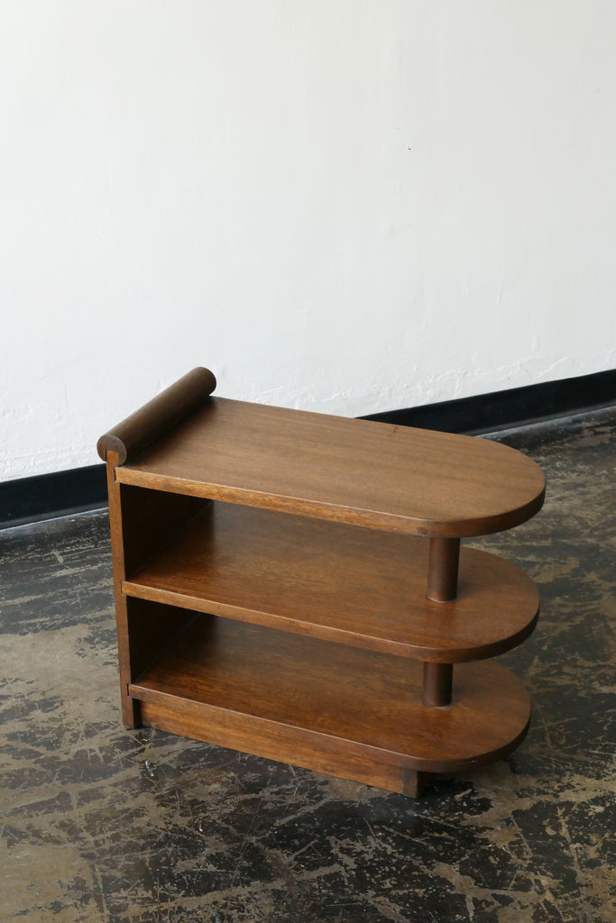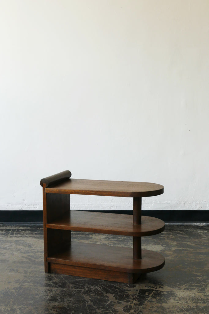 Small deco style handmade shelf or side table with curved ends and scroll detail.