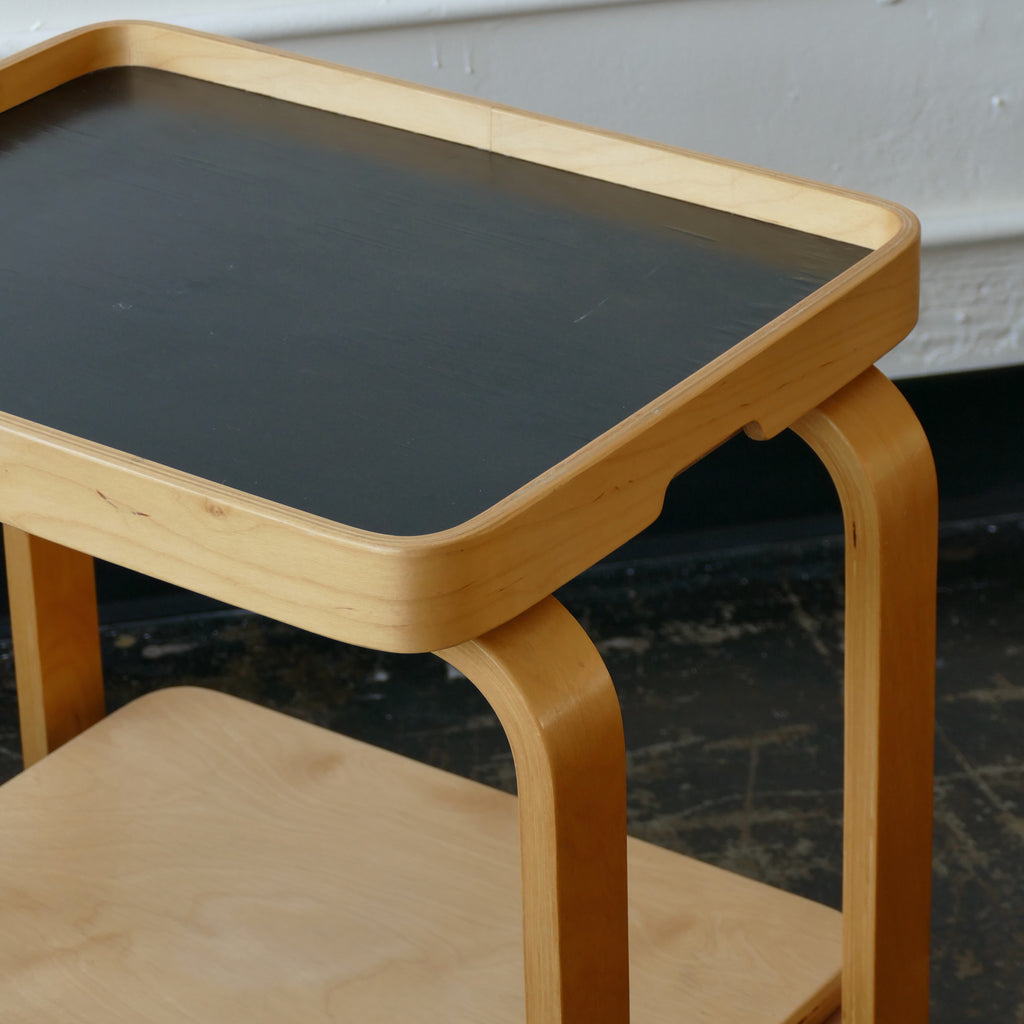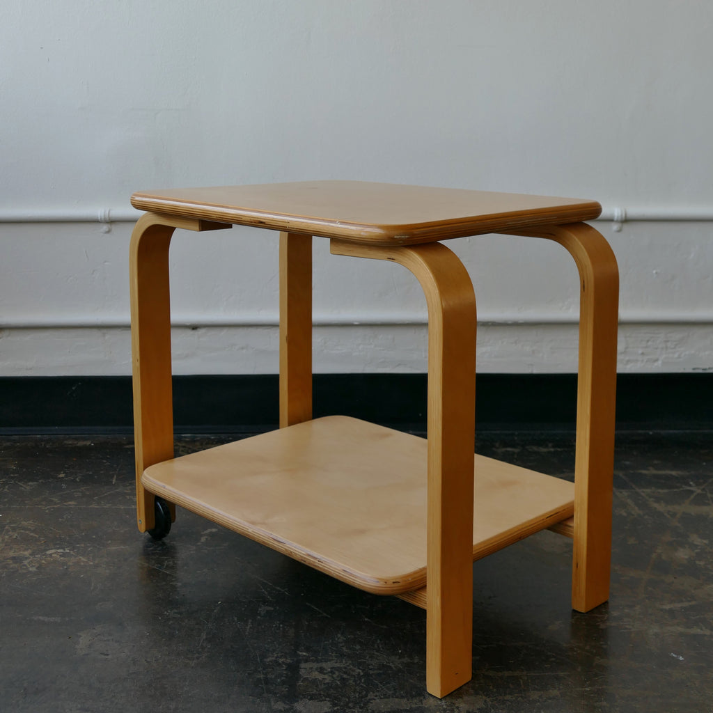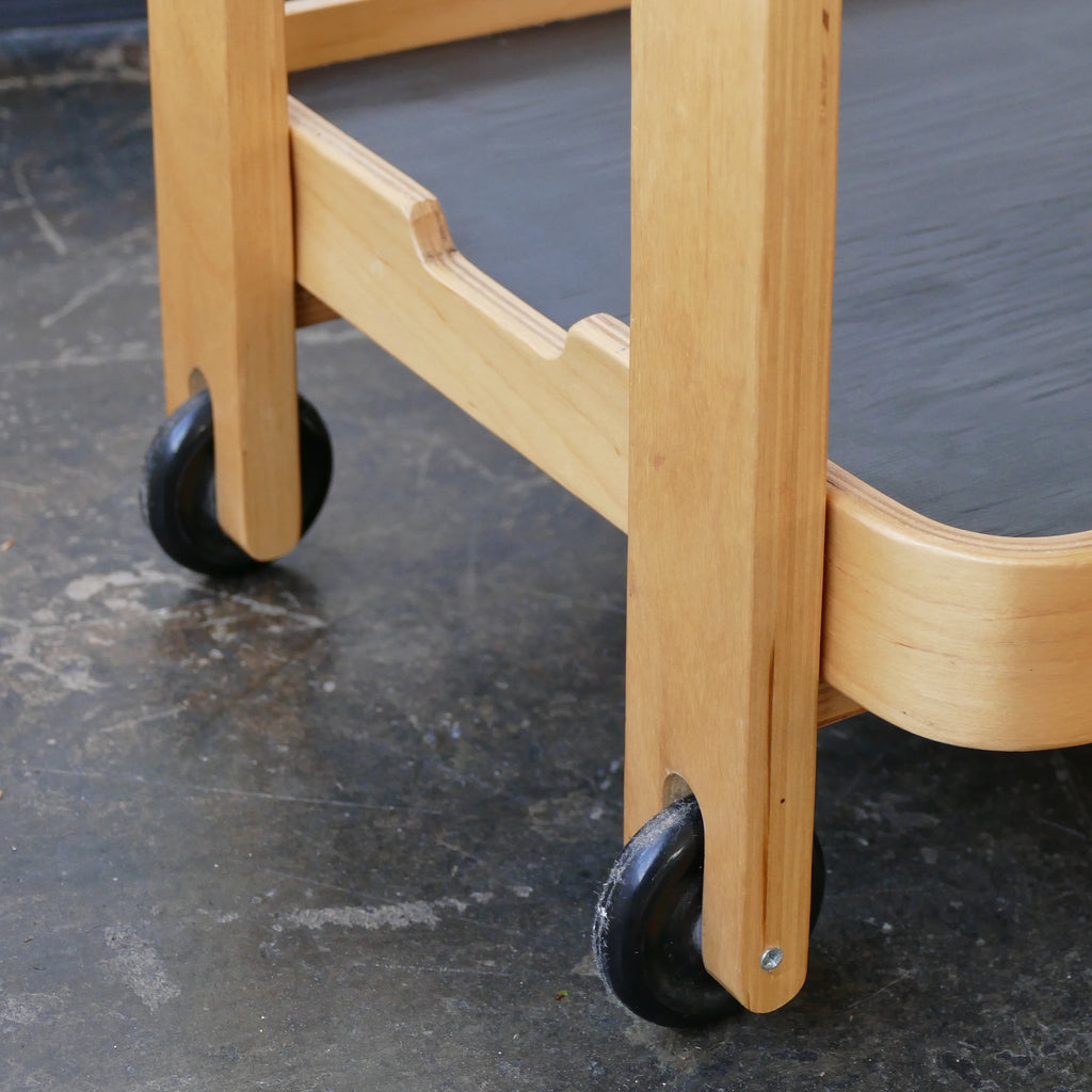 Ikea Brunabo trolley circa 2004, designed by Carina Bengs. Remniscent of Alvar Aalto. Blonde bentwood trolley/side table with two wheels and removable tray with black painted inset. Tray is finished on both sides and can sit on top or bottom shelf. Overall very good condition, some water damage to tray but no chips.