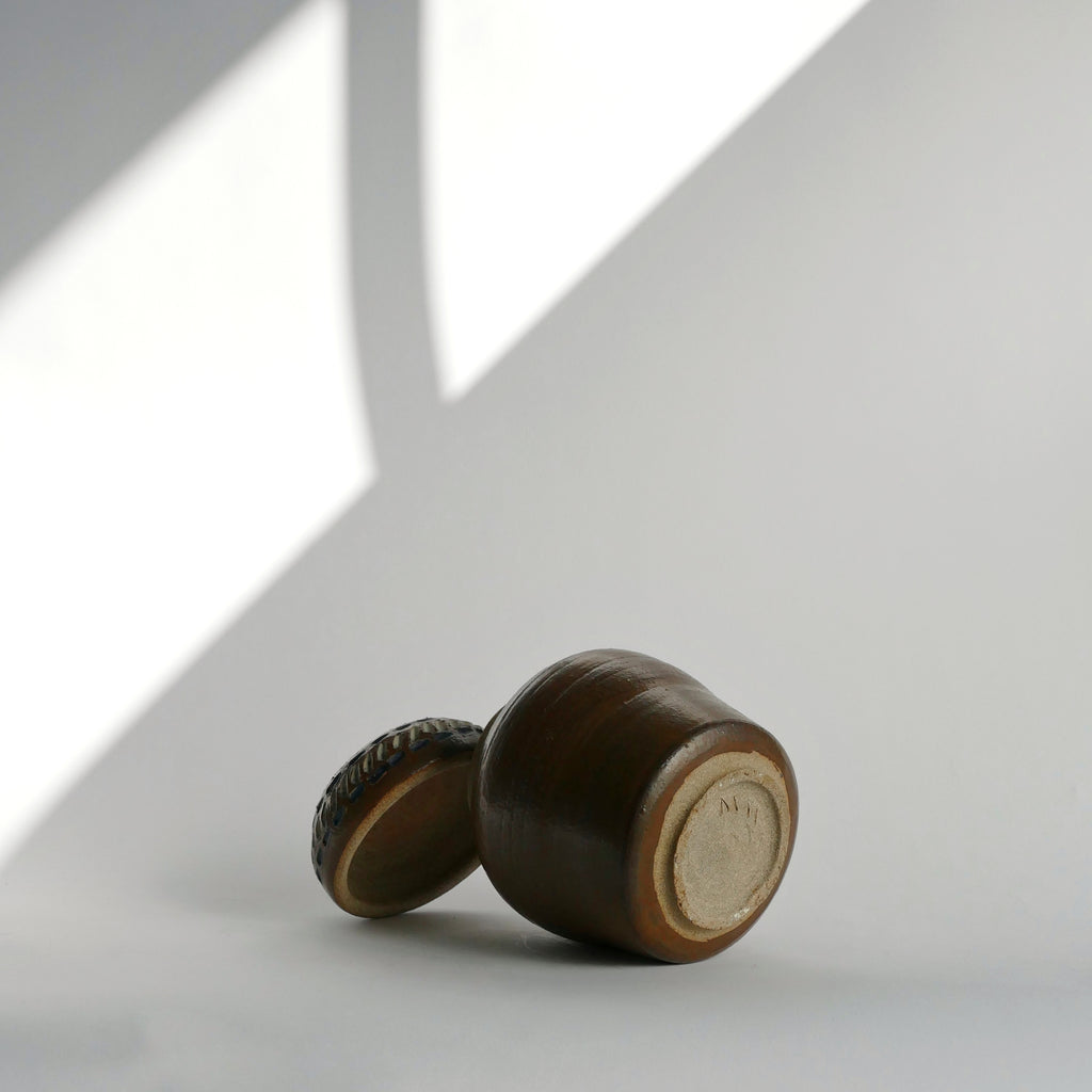 Sweet handmade ginger jar with lid, perfect for furry friends' treats! Lid features incised details of blue and sage. Excellent condition, signed.