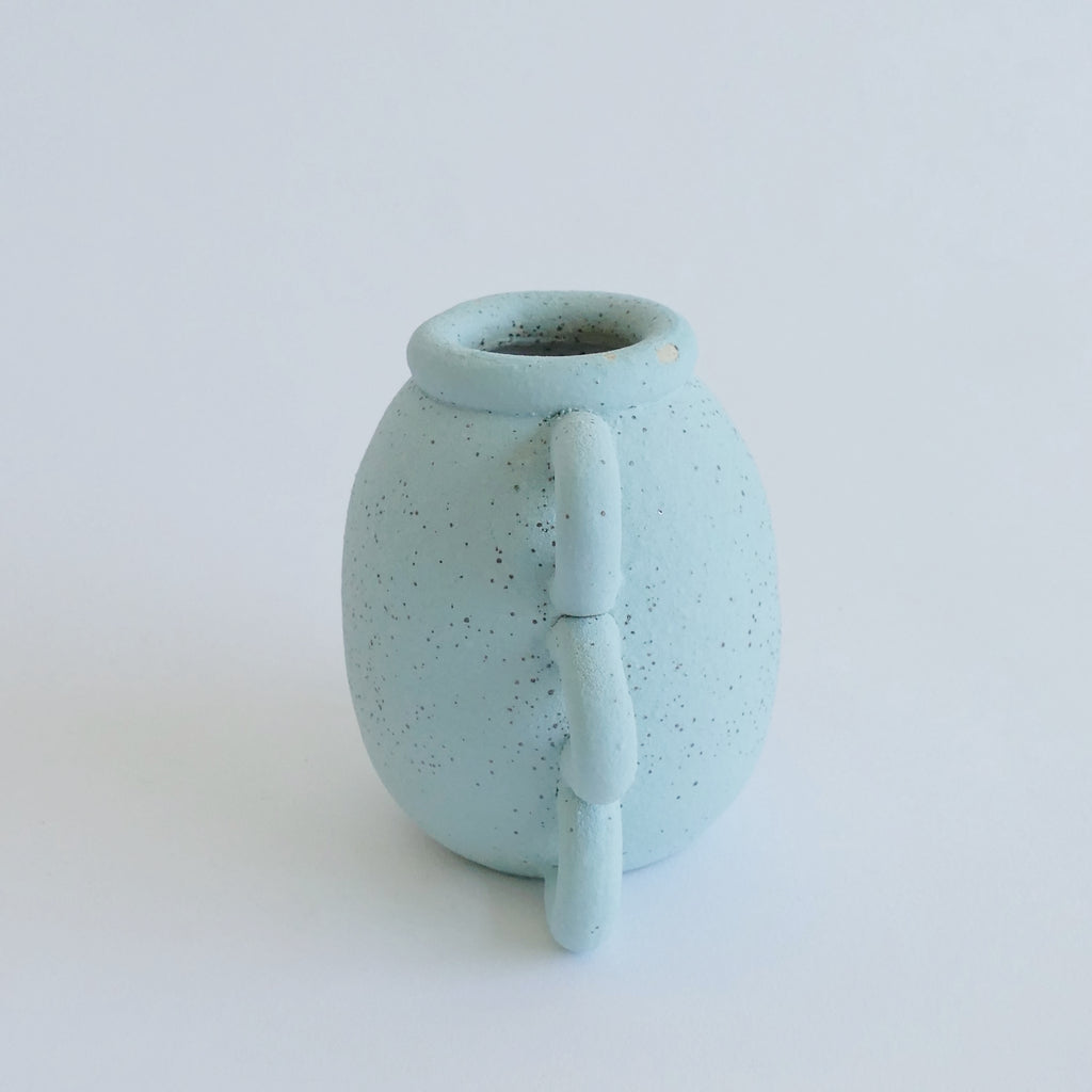 Our personal favorite of the Martie Kilmer collection. Matte speckled robin's egg blue amphora with delicate handles. Please note, this one has a small chip in the glaze-only on the lip.