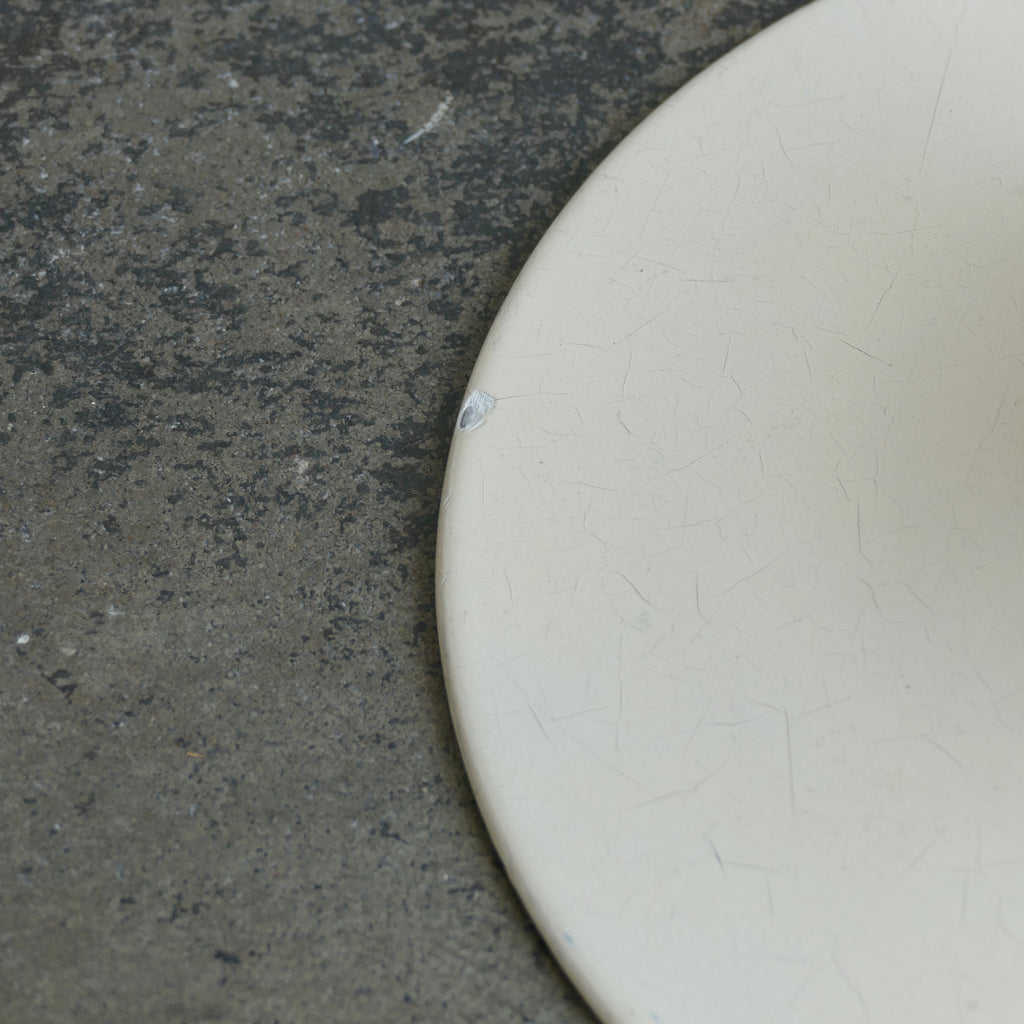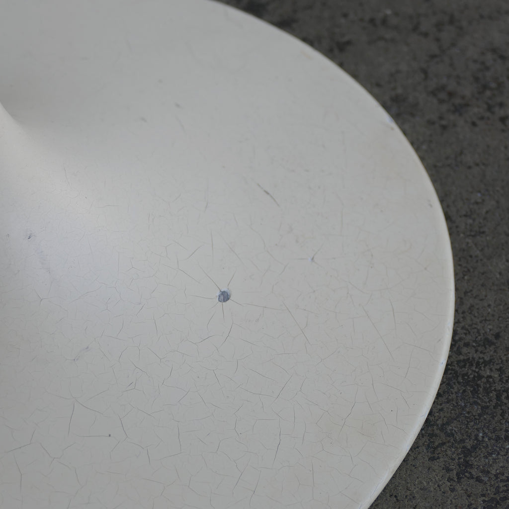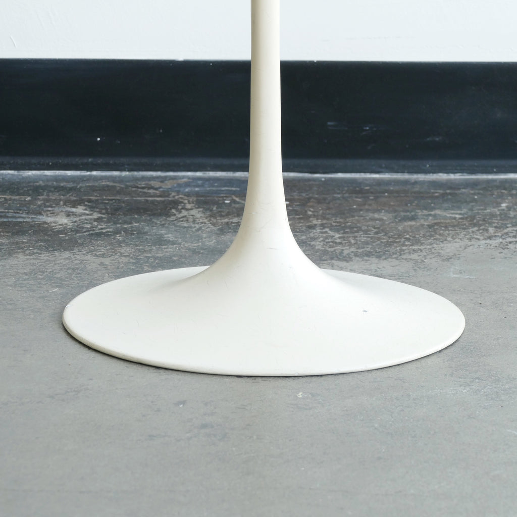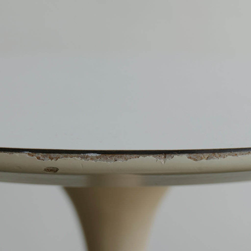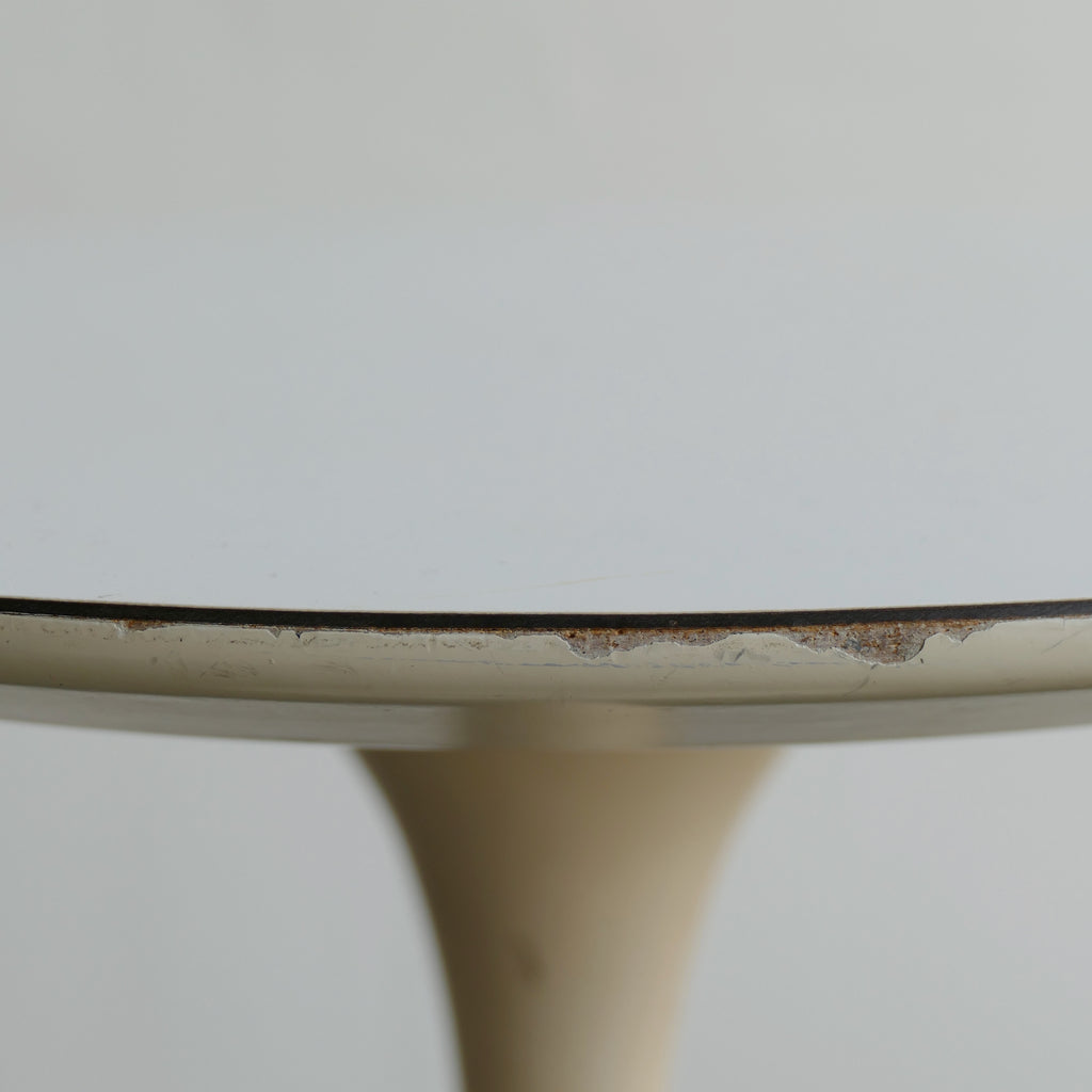 Vintage tulip side table. Attributed to Knoll/ or Burke, circa 1960s. No markings. Laminate top and heavy weighted base. Laminate top is free of cracks and chips. The edge of the top has nicks in paint as shown. Cracking in base, a few small chips as shown. Overall very good age appropriate condition.
