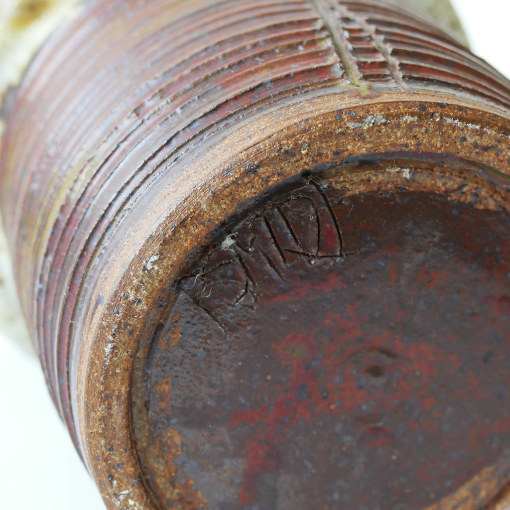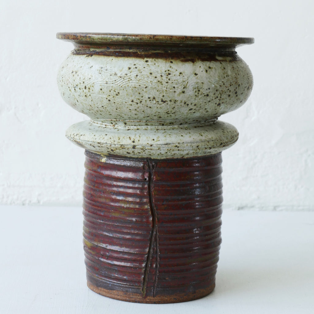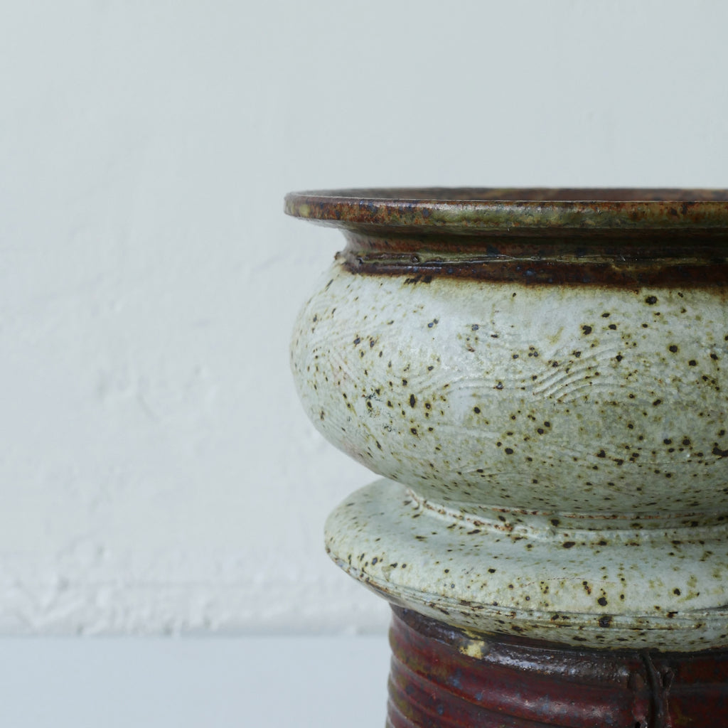 Nice, larger sized textured vintage stoneware vase. Lovely form and colors.