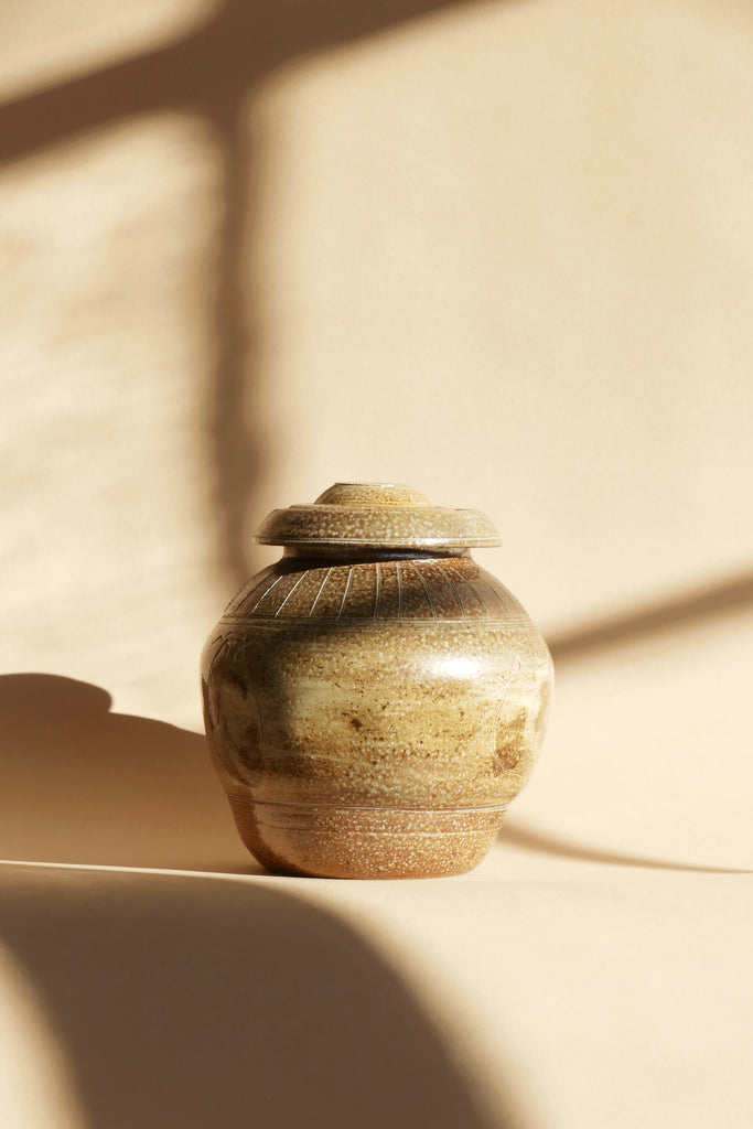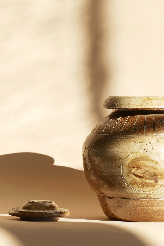 Ginger jar or urn-shaped lidded vessel. Excellent condition, no flaws to note. Lovely drawings of the vessel are etched into it throughout.