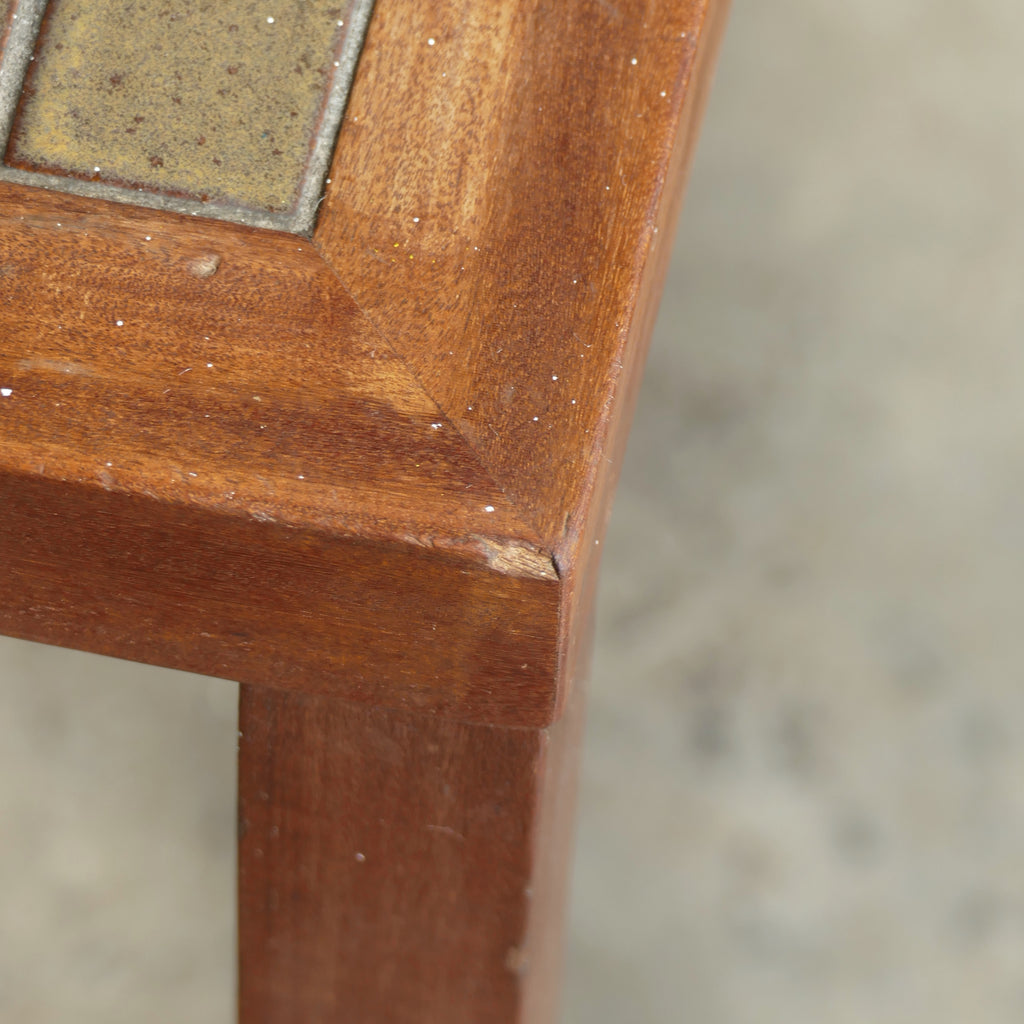 Mid century tiled side table by Jane and Gordon Martz for Marshall Studios. Avocado green ceramic tile inlay inside a walnut frame. Overall very good vintage condition, some abrasions on leg as shown, and light nicks and scratches throughout the wood frame and legs. No chips or cracks in tile.