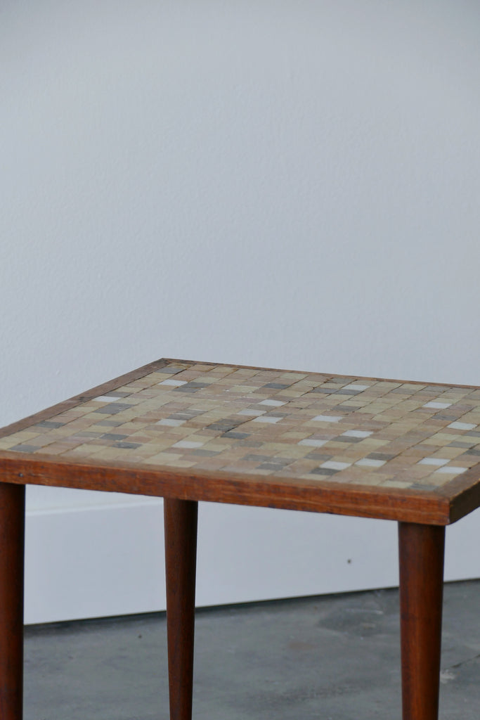 Sweet tiled side table with classic mid century tapered legs and brass feet. Legs screw on and off for easy packing and moving. Decent vintage condition with age appropriate wear.