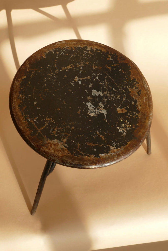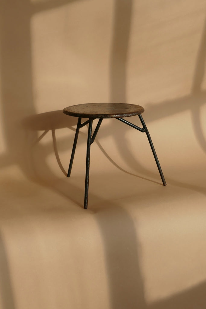 Simple mid century metal tripod plant stand with all-over patina.