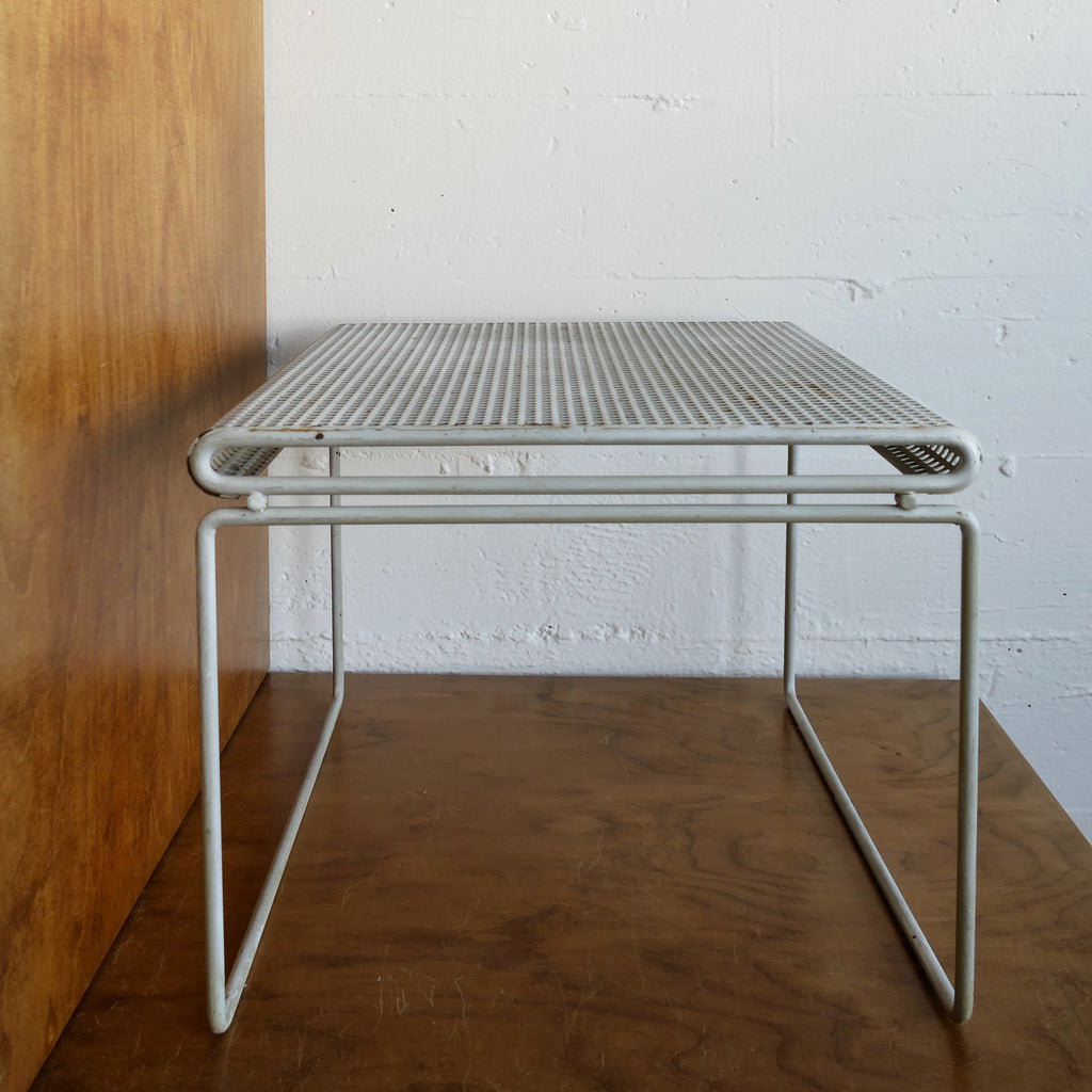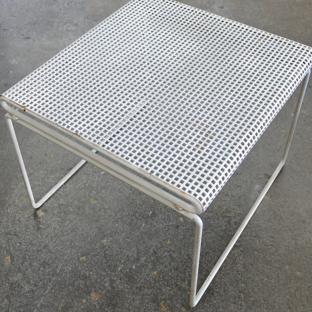 Perforated vintage side table after Mathieu Matégot. Coated iron, areas of wear throughout. One loose weld as shown. Patina is fabulous IMO ❤️