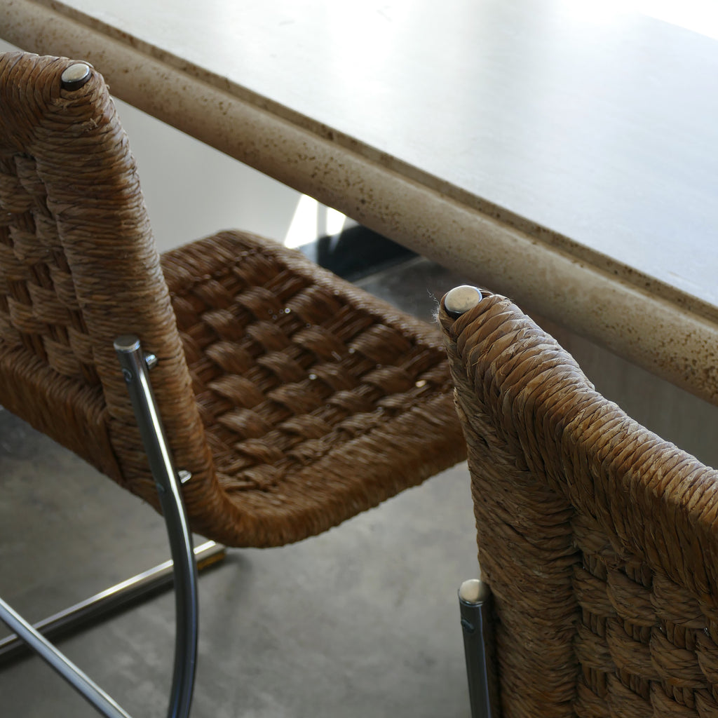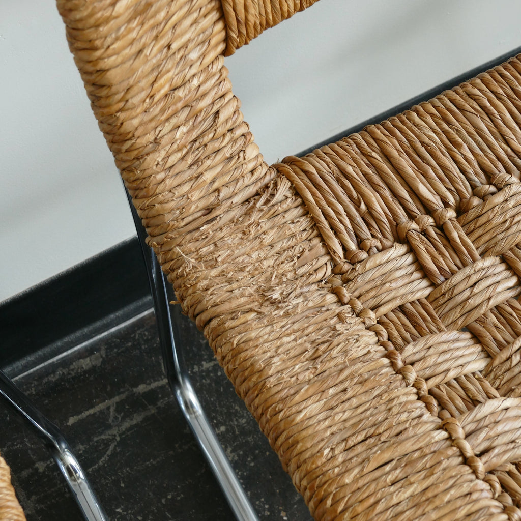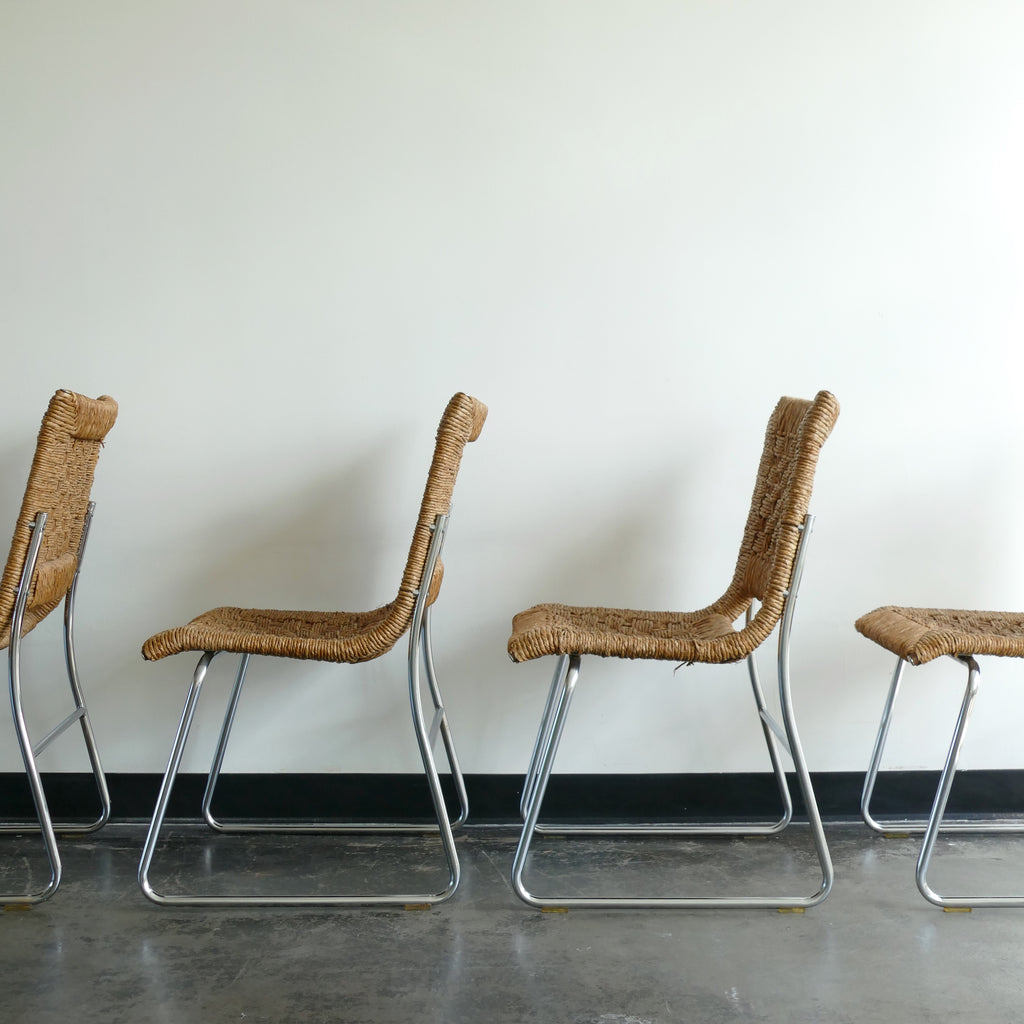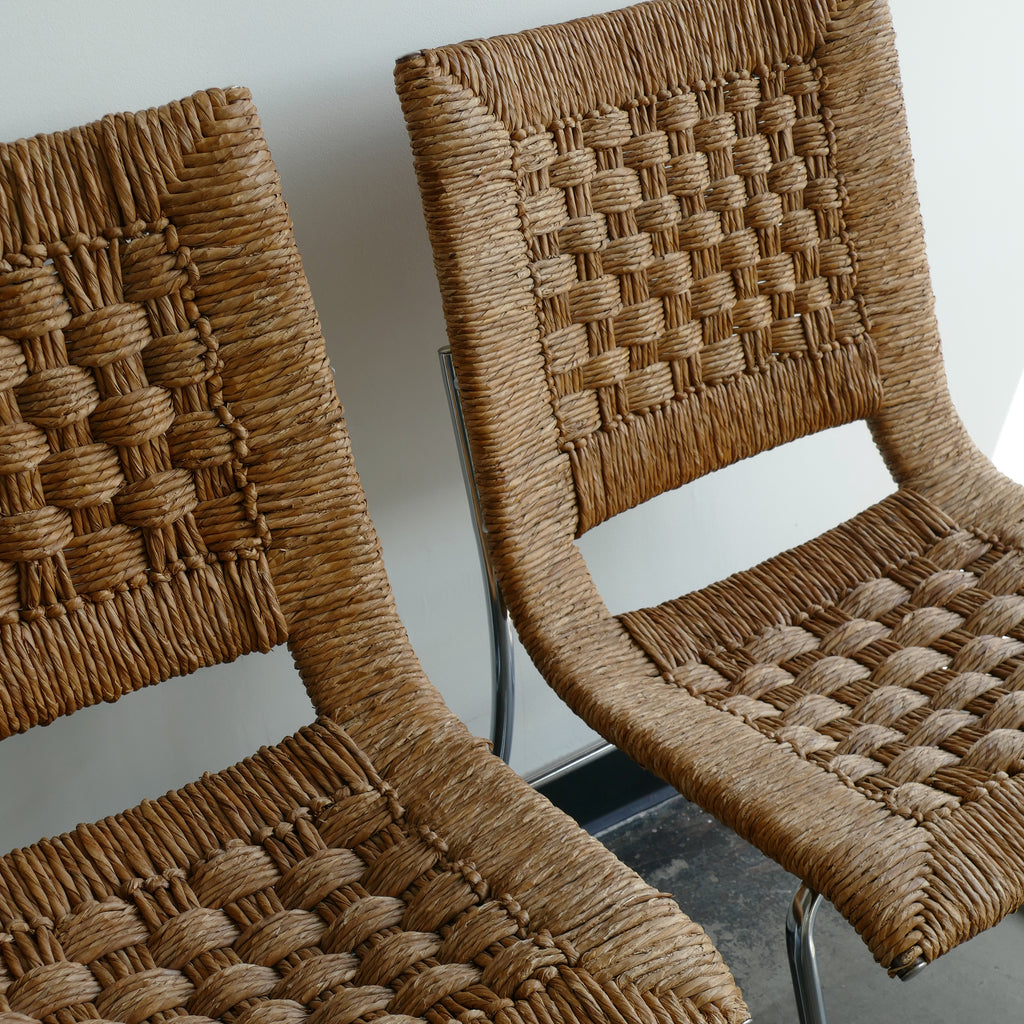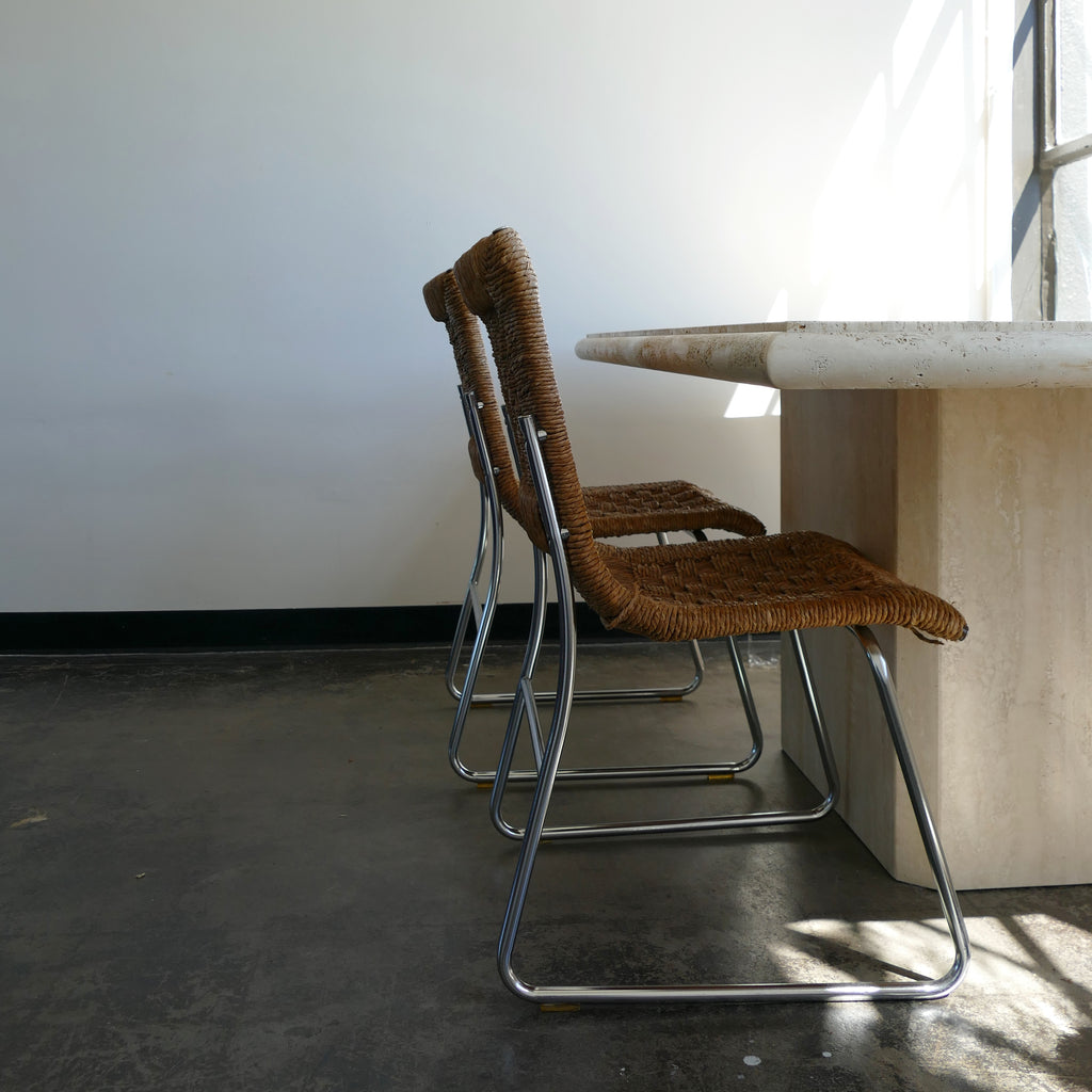 Set of four vintage cord and chrome dining chairs. Designer and history unknown. Overall excellent condition. One chair has one specific area of wear. The set is in excellent age appropriate condition. Details shown in images. These contrast nicely with other textures.
