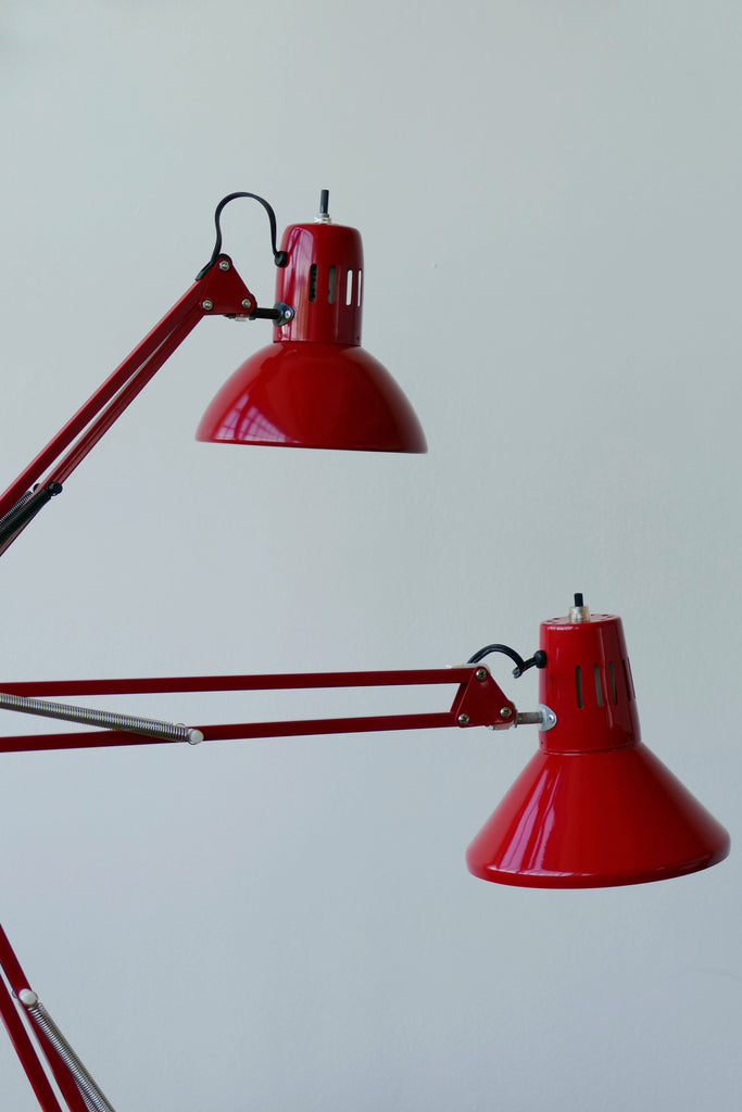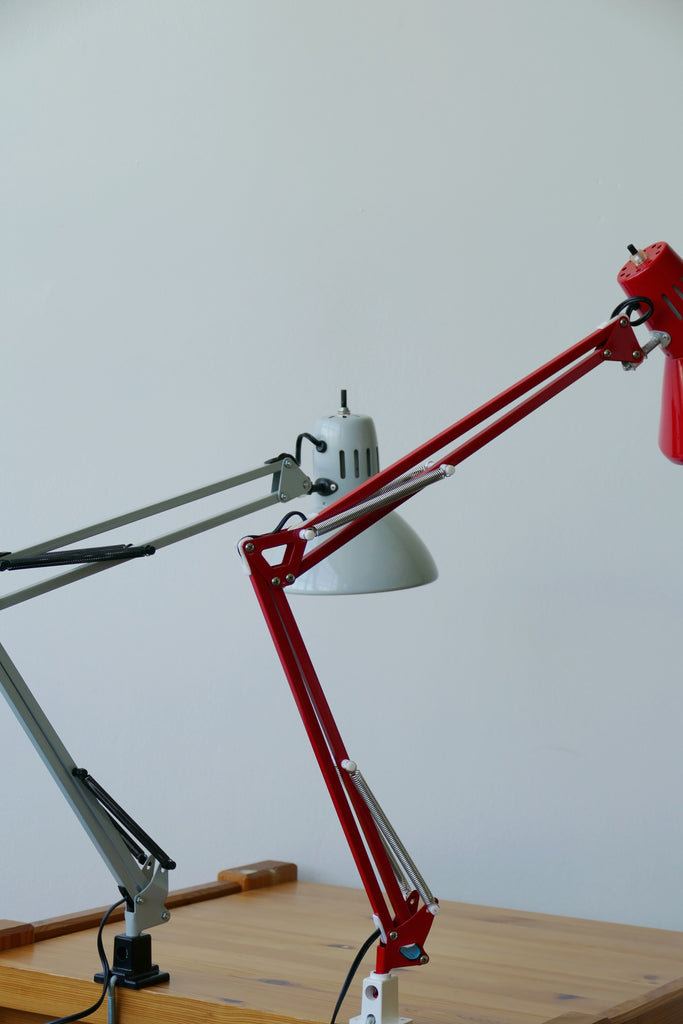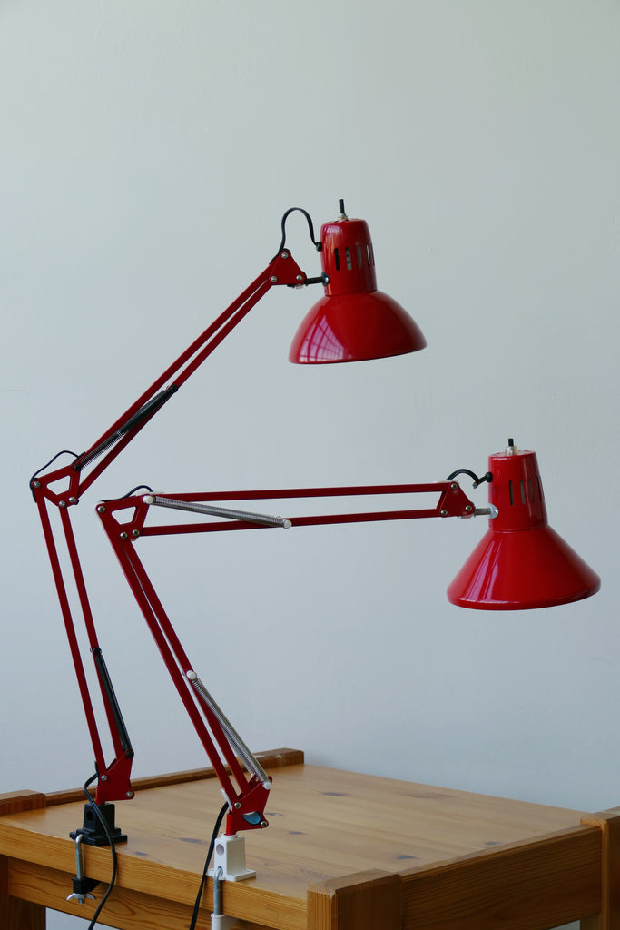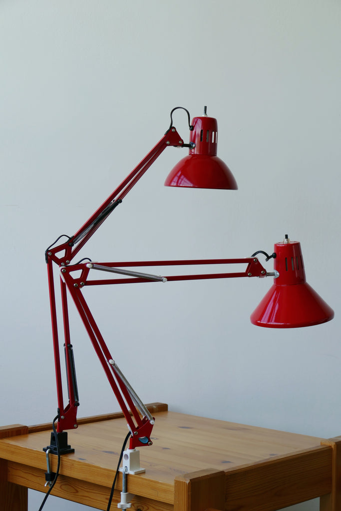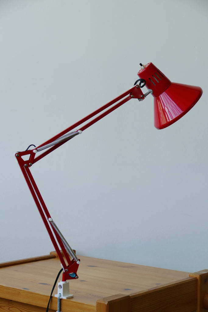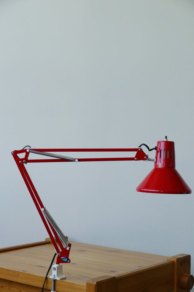 Vintage red enamel architect's swing arm lamp in perfect condition. Clamps onto any surface with a lip and can be adjusted at a variety of angles.