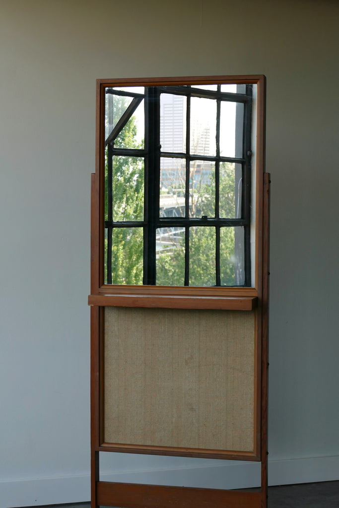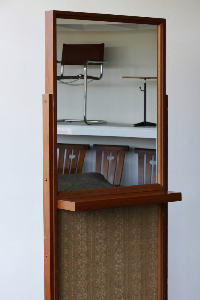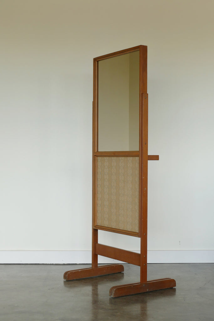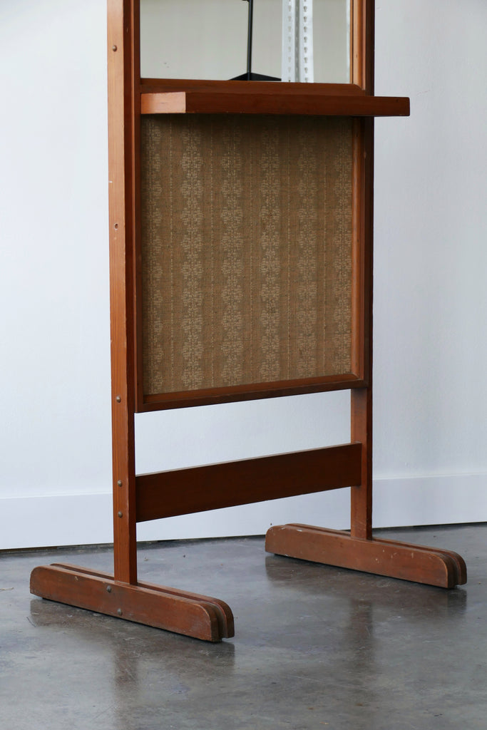 Incredible double sided folk art floor or dressing mirror, circa 1960s. Made from redwood, this piece features fabric panels and one shelf. One mirror is smoked. Missing 1 plug (easily replaced). A stunning piece of craft; we absolutely love this functional art.