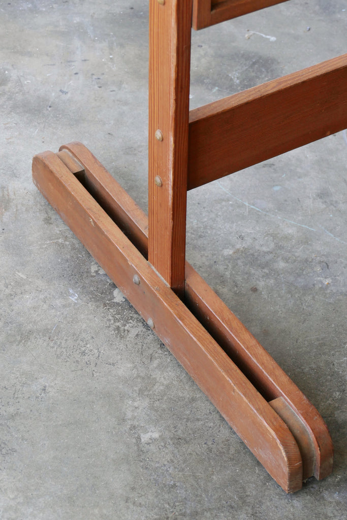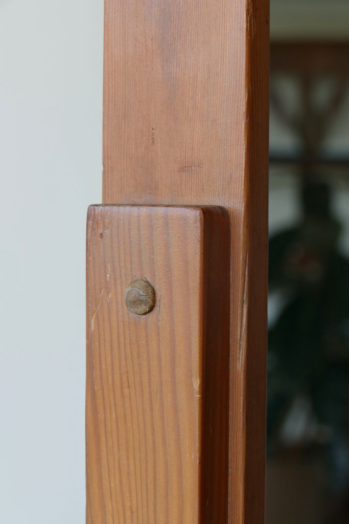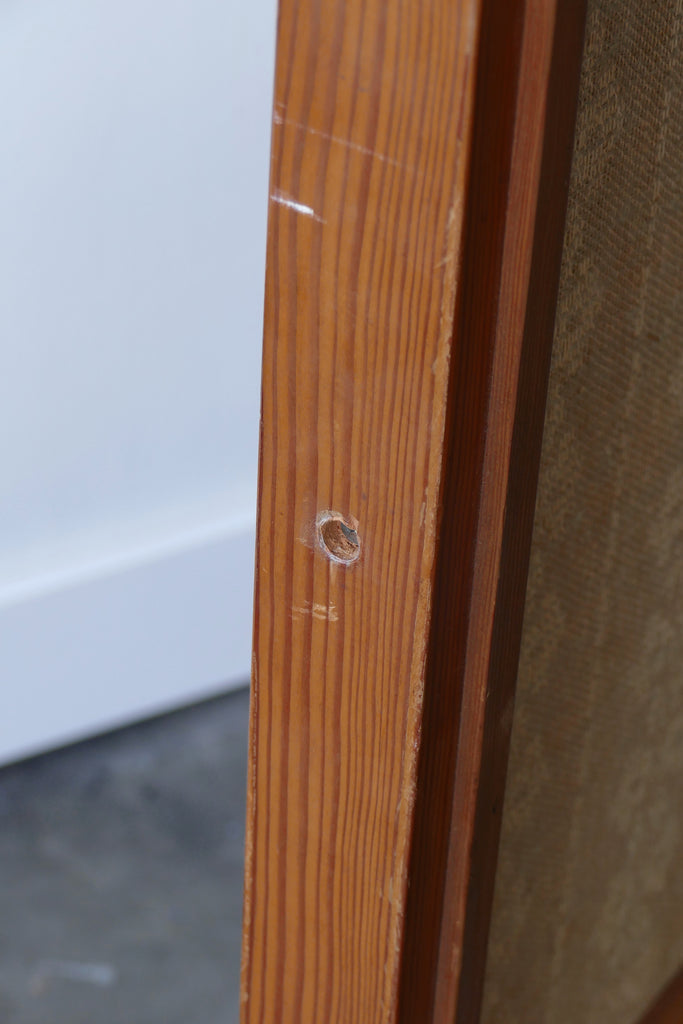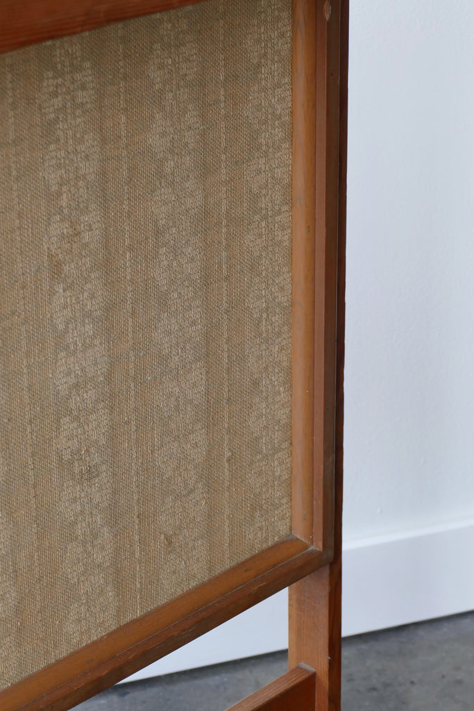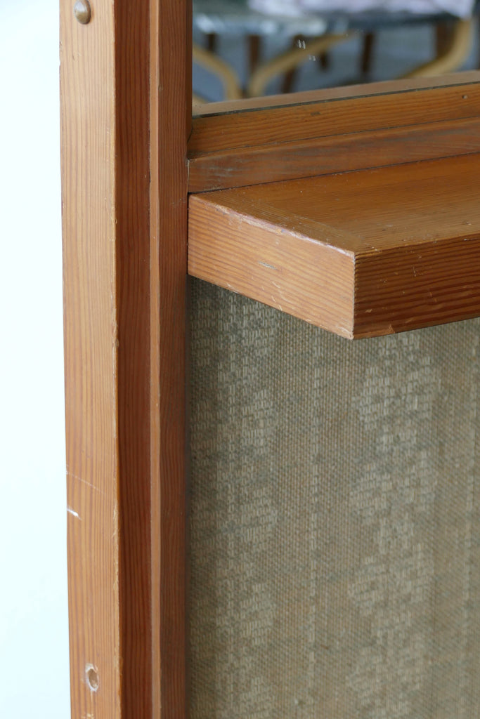 Incredible double sided folk art floor or dressing mirror, circa 1960s. Made from redwood, this piece features fabric panels and one shelf. One mirror is smoked. Missing 1 plug (easily replaced). A stunning piece of craft; we absolutely love this functional art.