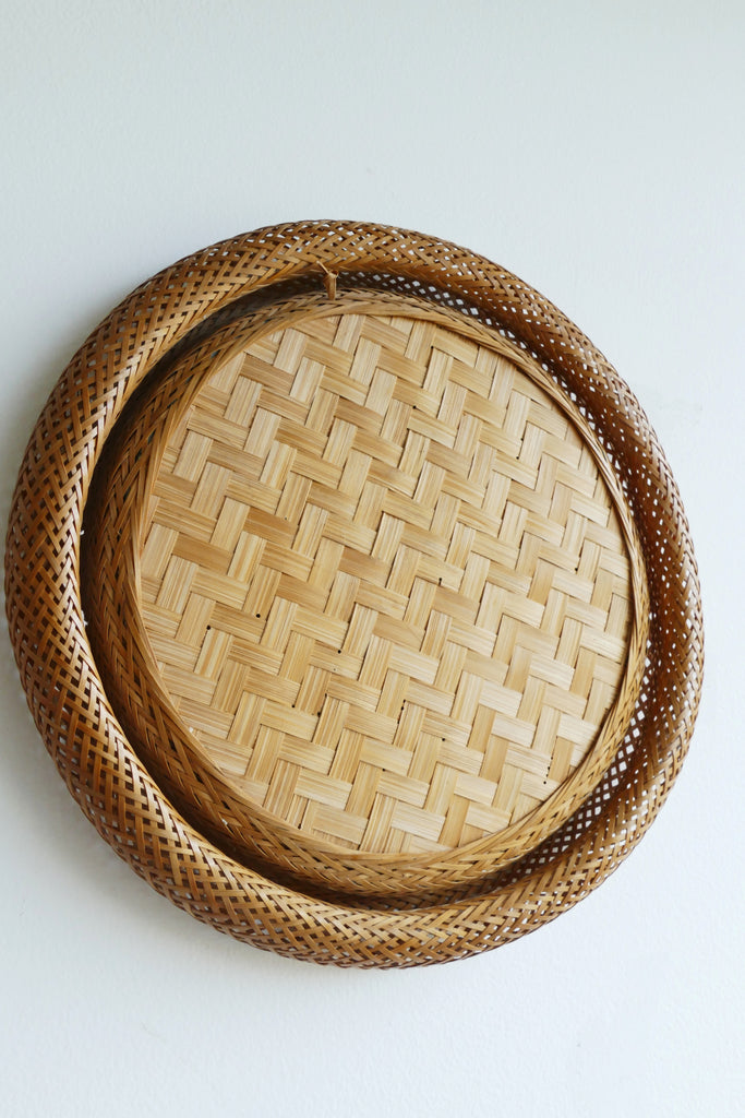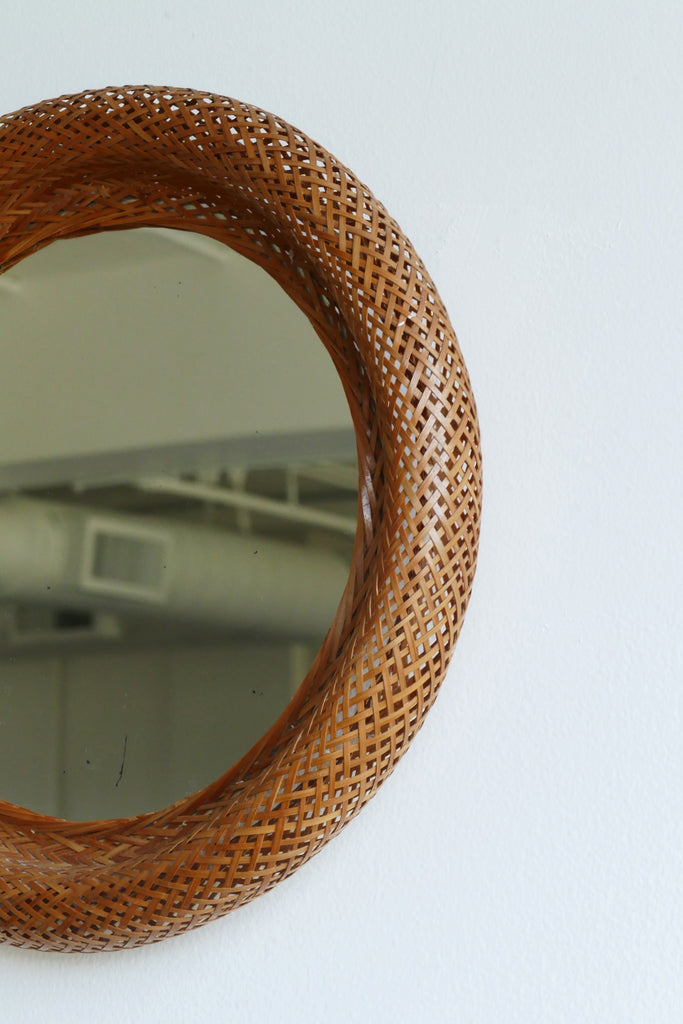 Simple round vintage mirror woven with wicker. Small scratches on mirror as shown in close-up. Overall very good vintage condition.
