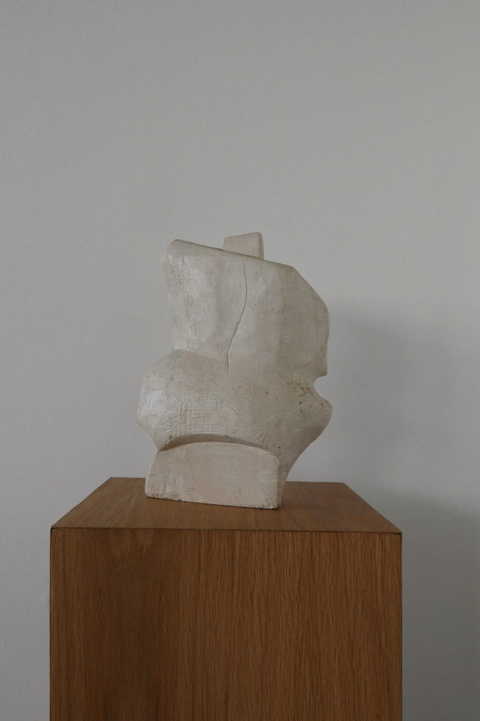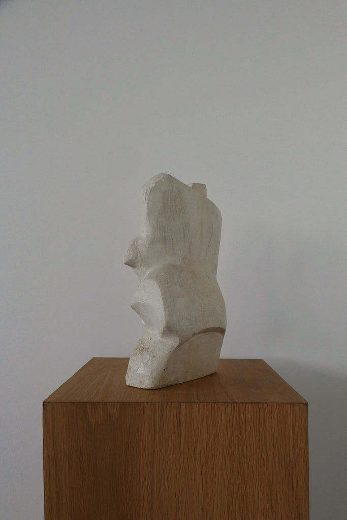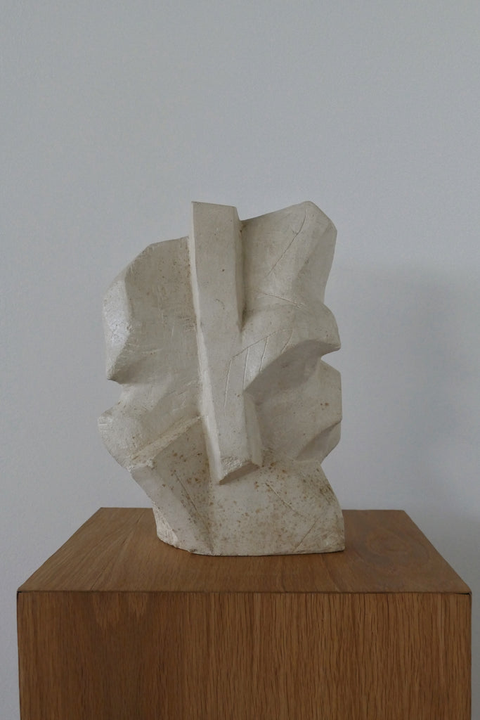 Beautiful, heavy abstract sculpture crafted from stone, with a travertine/plaster look. Possibly figural? Uniform all-over wear. Unsigned.
