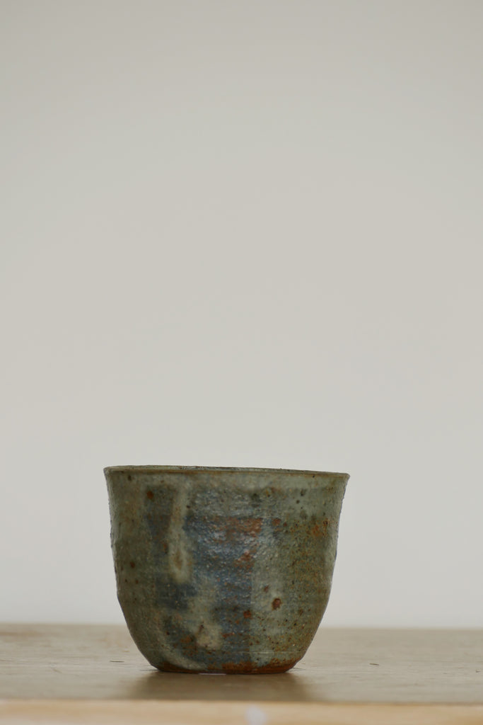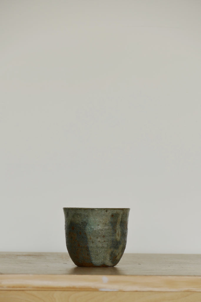 Single small textured ceramic cup in greenish/bluish/gray glaze. Very sweet and nicely sized.