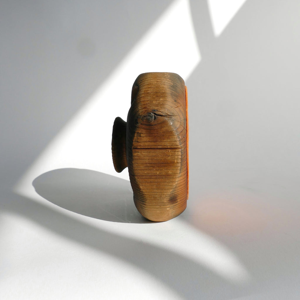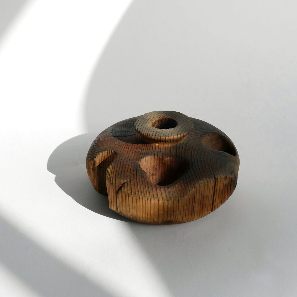 Small and squat carved wood vase for holding dried fauna. Lightweight, made by Norm Gough.