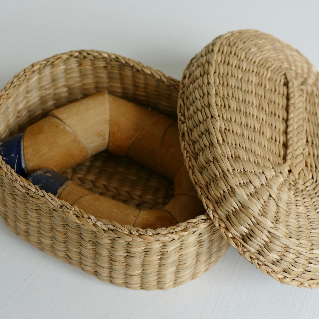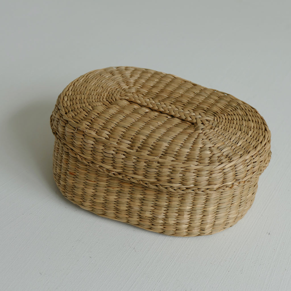 Small lidded grass basket; slightly wonky.